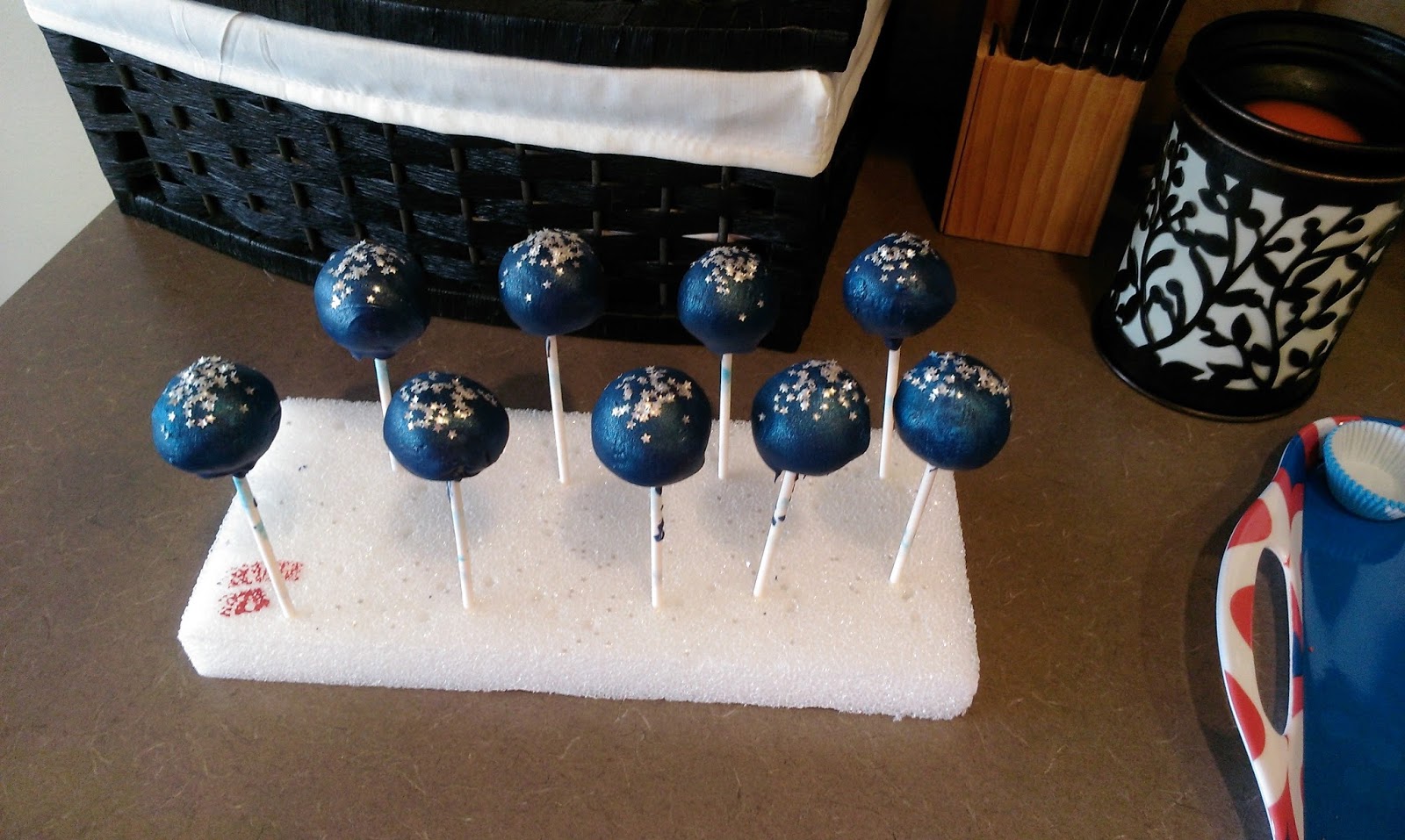 By the time you’ve luster dusted the white pops, you can remove the sticks from the red pops by gently wiggling the stick until they come loose. Since the pops, now cake balls, need to sit flat, take a small paring knife and trim away any uneven bottoms. I hate uneven bottoms on cakes, chairs, and people. And surprisingly enough, a little knife action can fix the problem for all three. Once you’ve…unstuck? the red pops, melt the blue chocolate and skewer the 9 remaining pops before chilling in the fridge. Come back and dip the last of the pops in the blue chocolate and let set for another half an hour in the fridge. This is where time adds up…with the waiting. Could you guess patience is not a virtue I possess? If you’re more than 5 minutes late to something, I think less of you as a person. Not that it matters. I think less of me as a person after what I did to that bucket of KFC earlier.