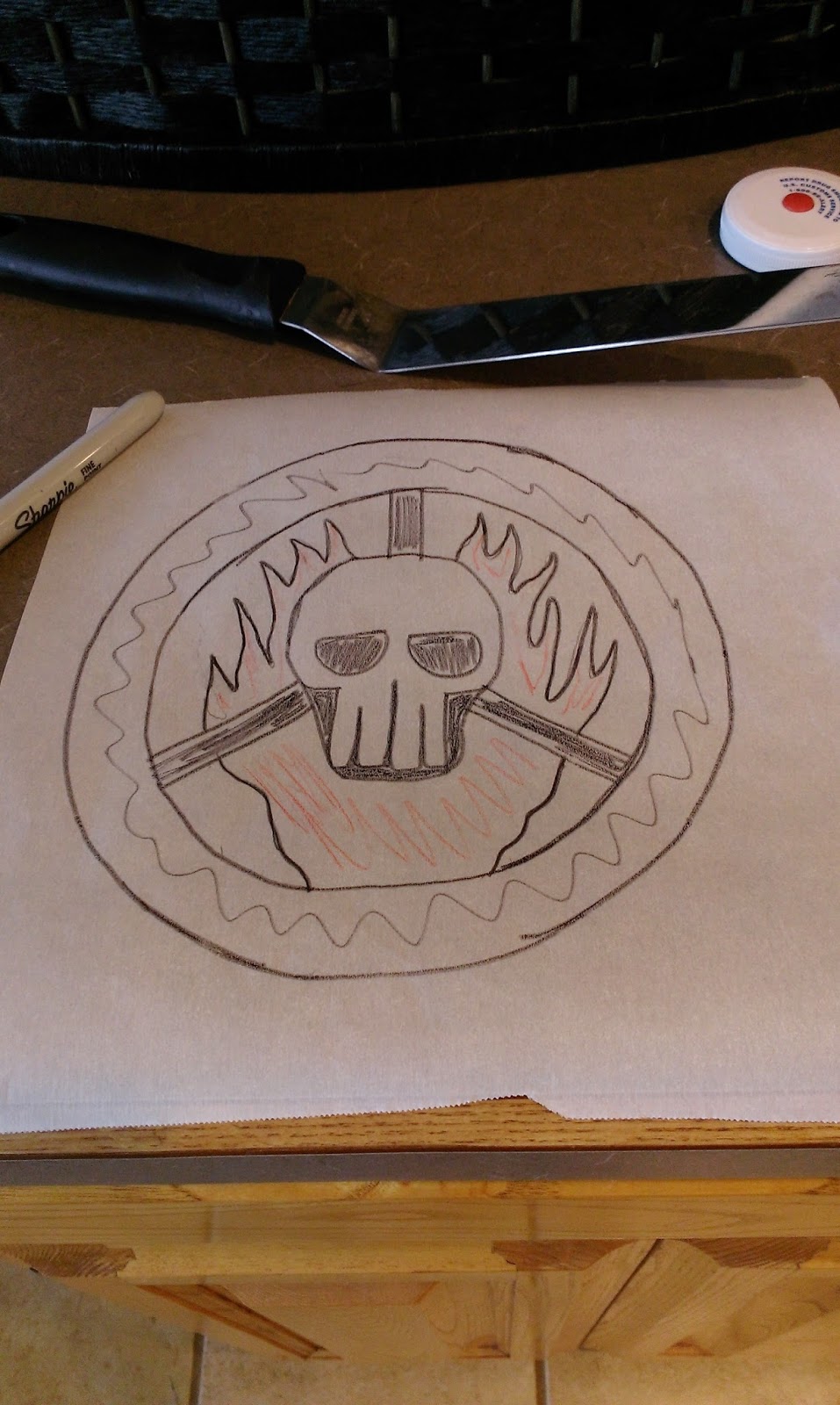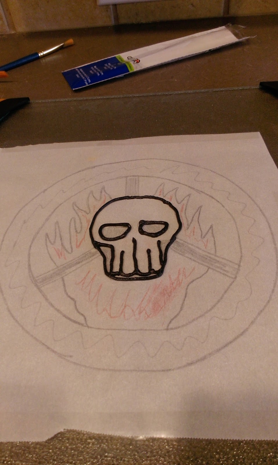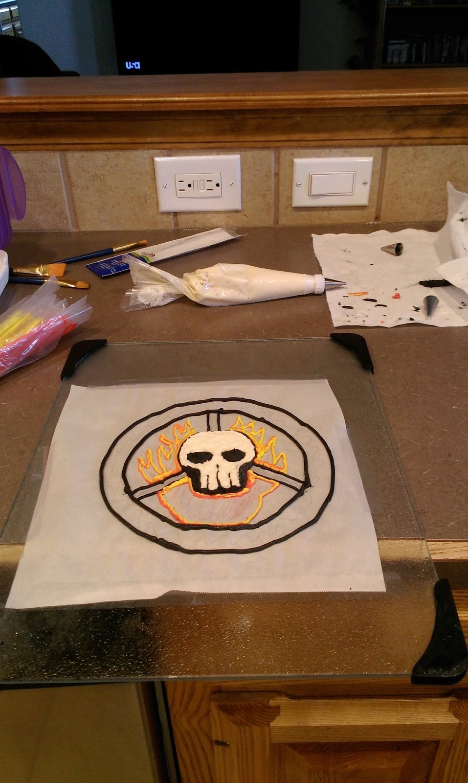 | As “witnessed” here. Once done outlining the fire and filling in the black areas on the skull, back to the freezer for another grueling 30 minutes. |