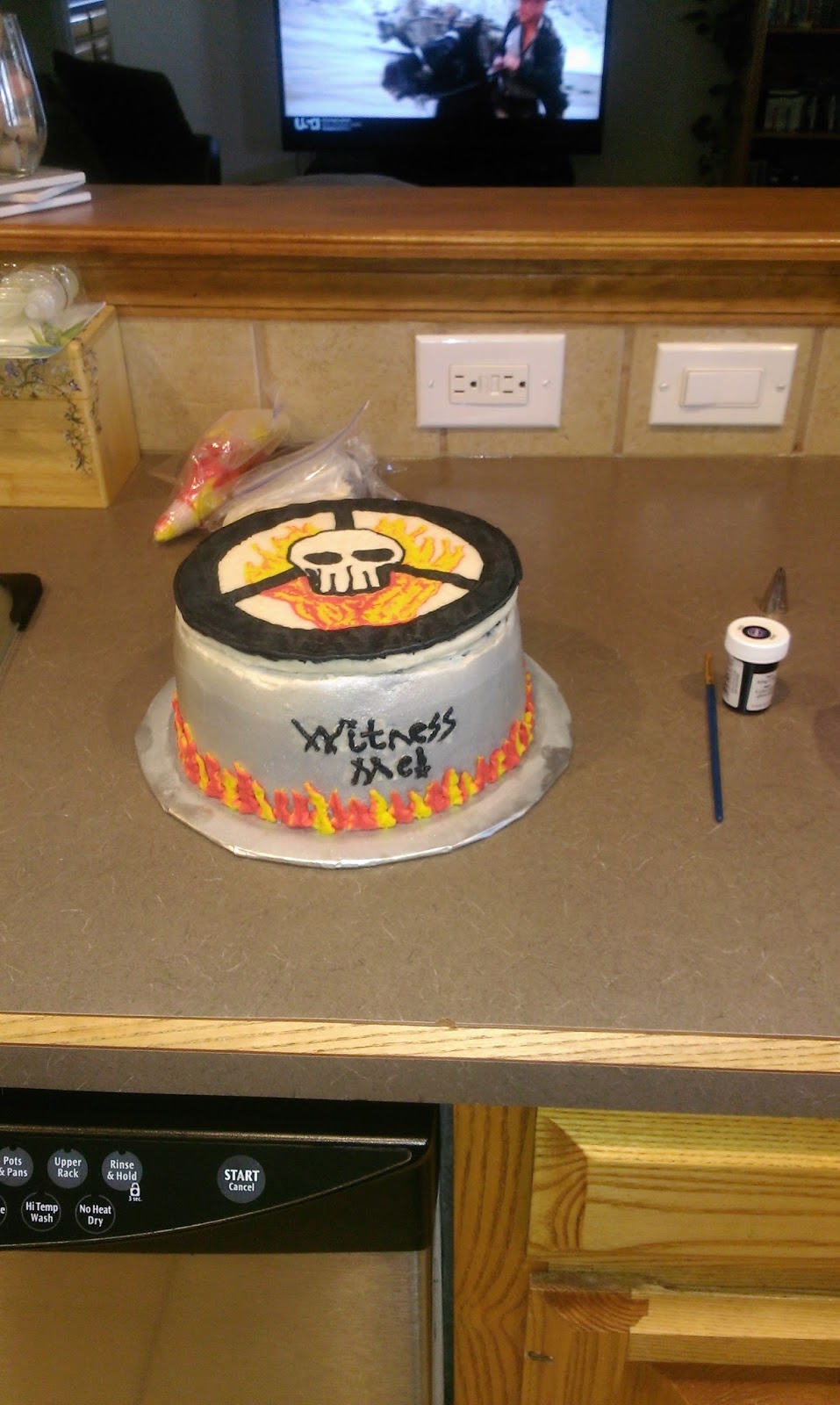 | I took a toothpick and scrawled in the War Boy mantra before piping over it with a #3 tip in black frosting. |