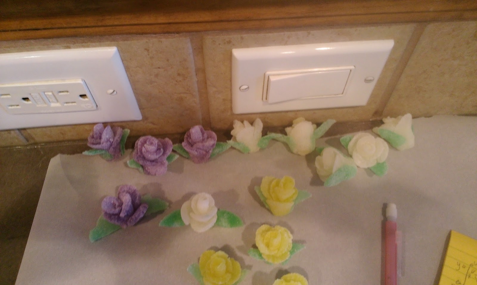 Once cooled and thickened, very slowly pour into the holes you earlier stabbed into your poor defenseless cake. If any runs off, just wipe up with a damp paper towel…or your finger. Place into the freezer for 15 minutes to firm up. But back before when I was cooling the filling in the fridge, I made my gumdrop roses:
