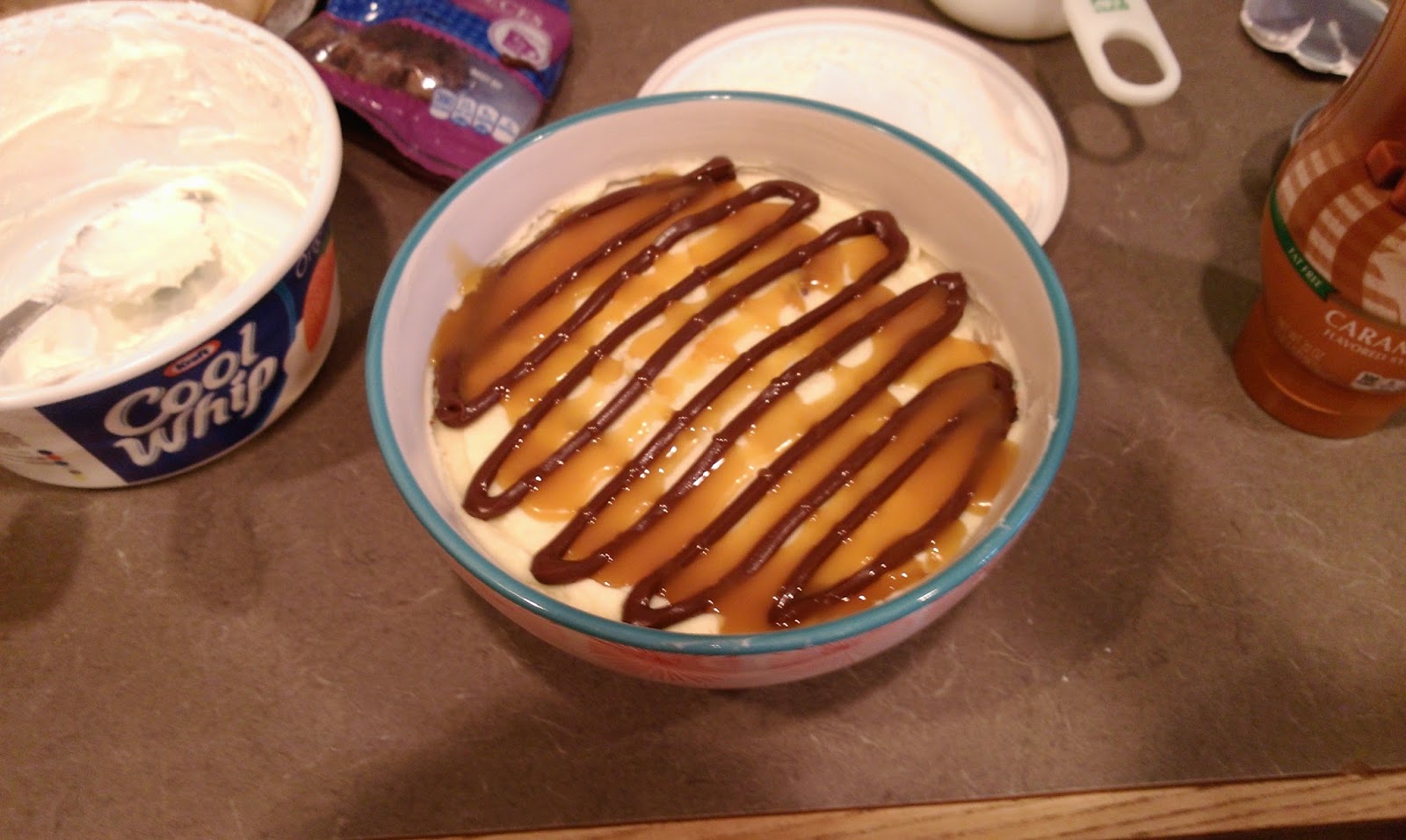 | Then add a nice layer of caramel sauce. Feel free to eat some of that, too. Caramel is delicious. |