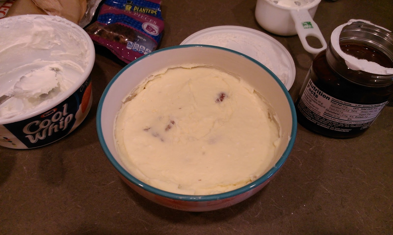 Start by creaming together the powdered sugar, Cool Whip, pudding mix, and cream cheese. Once well blended, add in your desired amount of pecans. I used half of a small bag and saved the rest for topping.