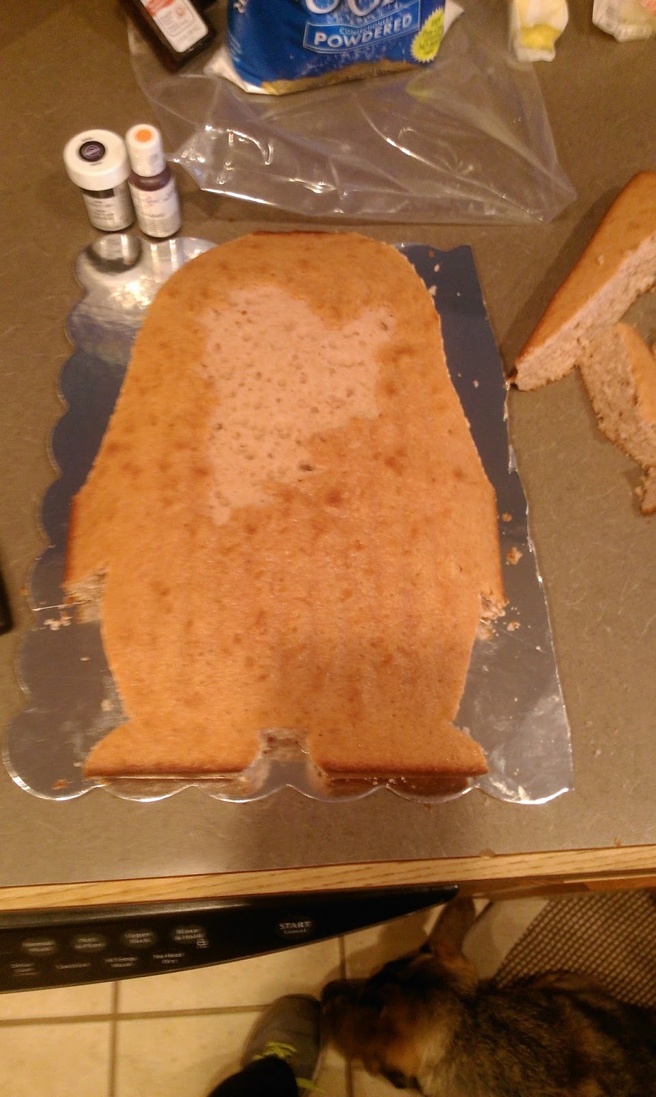 I like to draw templates when I’m going to make my cake into something that’s not in the standard wheelhouse of “round.” I drew out Kowalski (obviously by hand) so I had something to cut around on my cake.