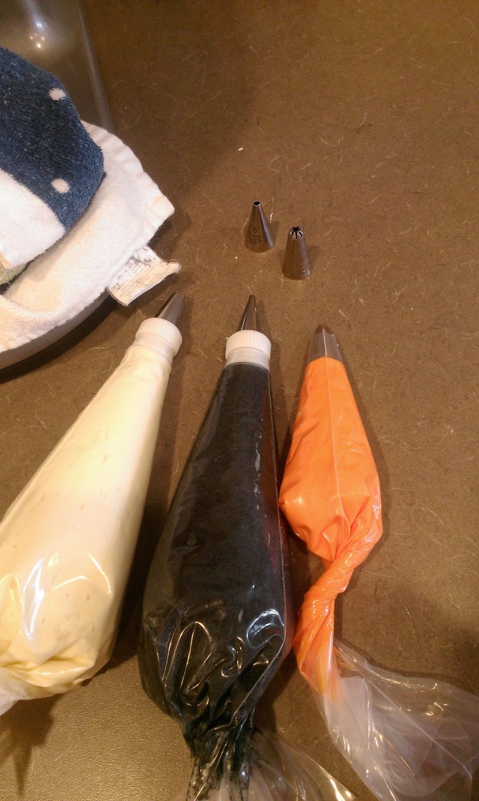 | You’re going to use EVERY bit of frosting for this cake, so sadly, don’t eat any. Instead dye a small amount orange and place into a bag fitted with an open star tip. I used a Wilton #21. Place a fair amount of white frosting into a bag with a coupler and for now, another open star tip. Dye a LARGE amount of frosting black. Place into a bag that has a coupler on it and fit with a small round tip. I used a #3. |