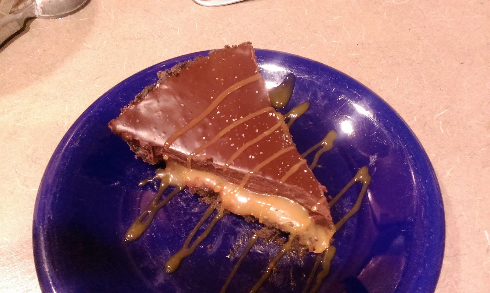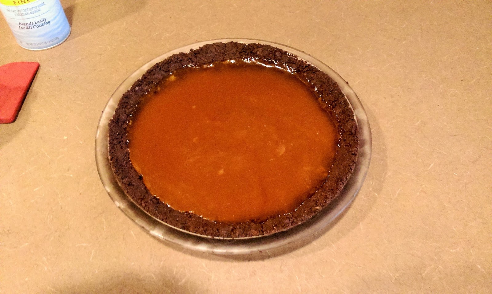 Once the crust is set and the caramel cooled, pour the caramel into the crust. Place back in to the freezer for 40 minutes so the caramel can firm up and form a skin. This way the layers of chocolate and caramel stay separate later.