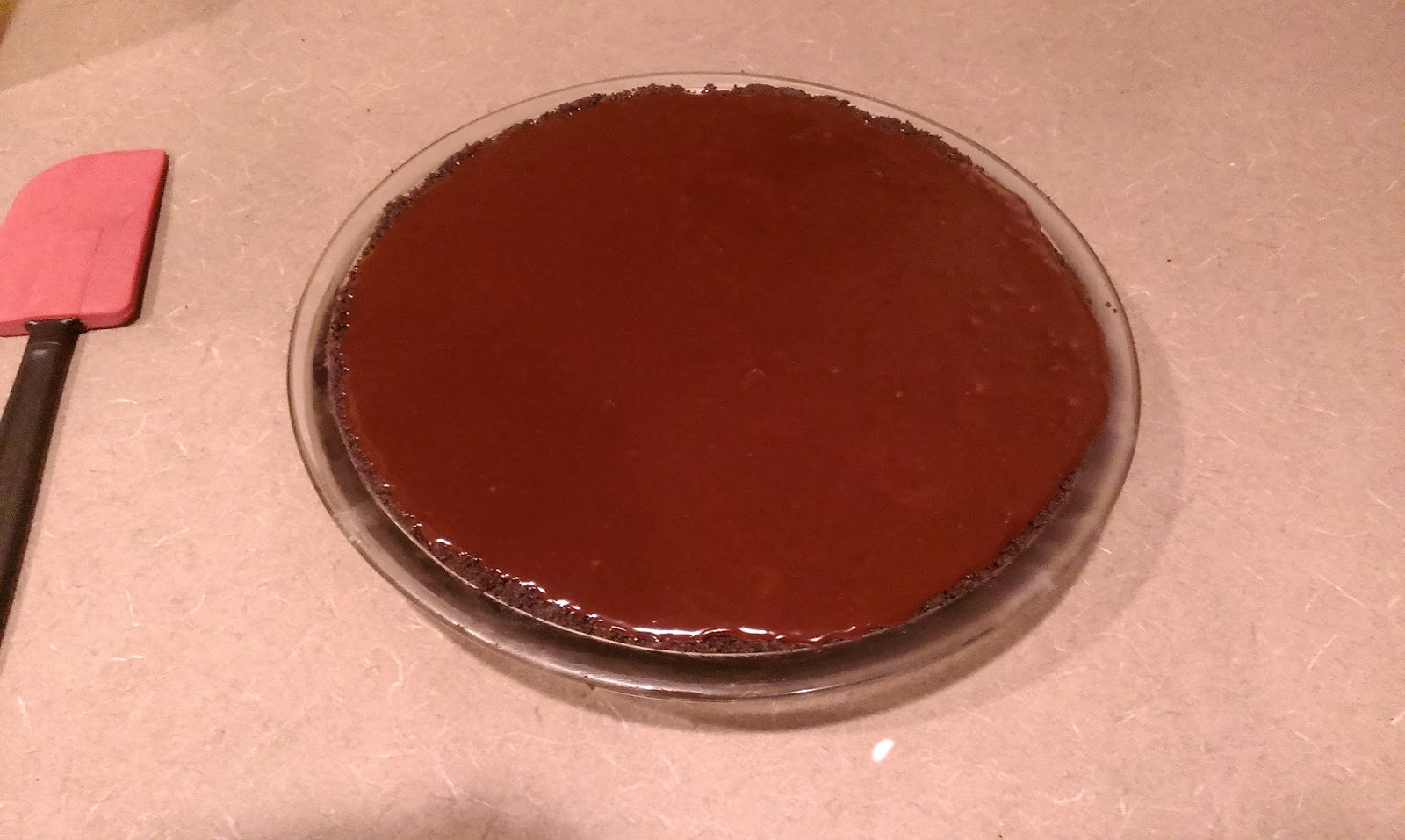 Once the chocolate sauce is fully mixed, get the pie out of the freezer and pour the final piece of the literal pie on top. If you need to smooth things out, go for it. I didn’t have any weird unevenness or lumpy bumps, so you’ll probably be fine. If anyone is gonna ruin a dessert, let it be me. I’ll still eat it. Place the pie back in the freezer to set for 2 hours or into the fridge overnight.