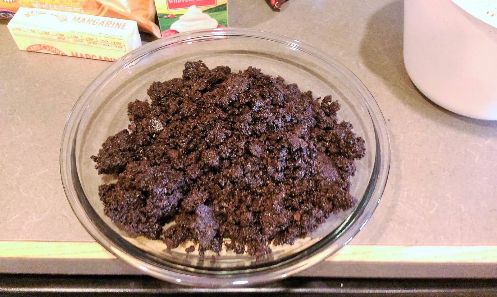 To make the crust, blend about 10 Oreos at a time into a fine pulp and dump into a medium-sized bowl. Once the Oreos are all crushed, melt one stick of butter in the microwave, and then blend it together with the crumbs to form a crust.