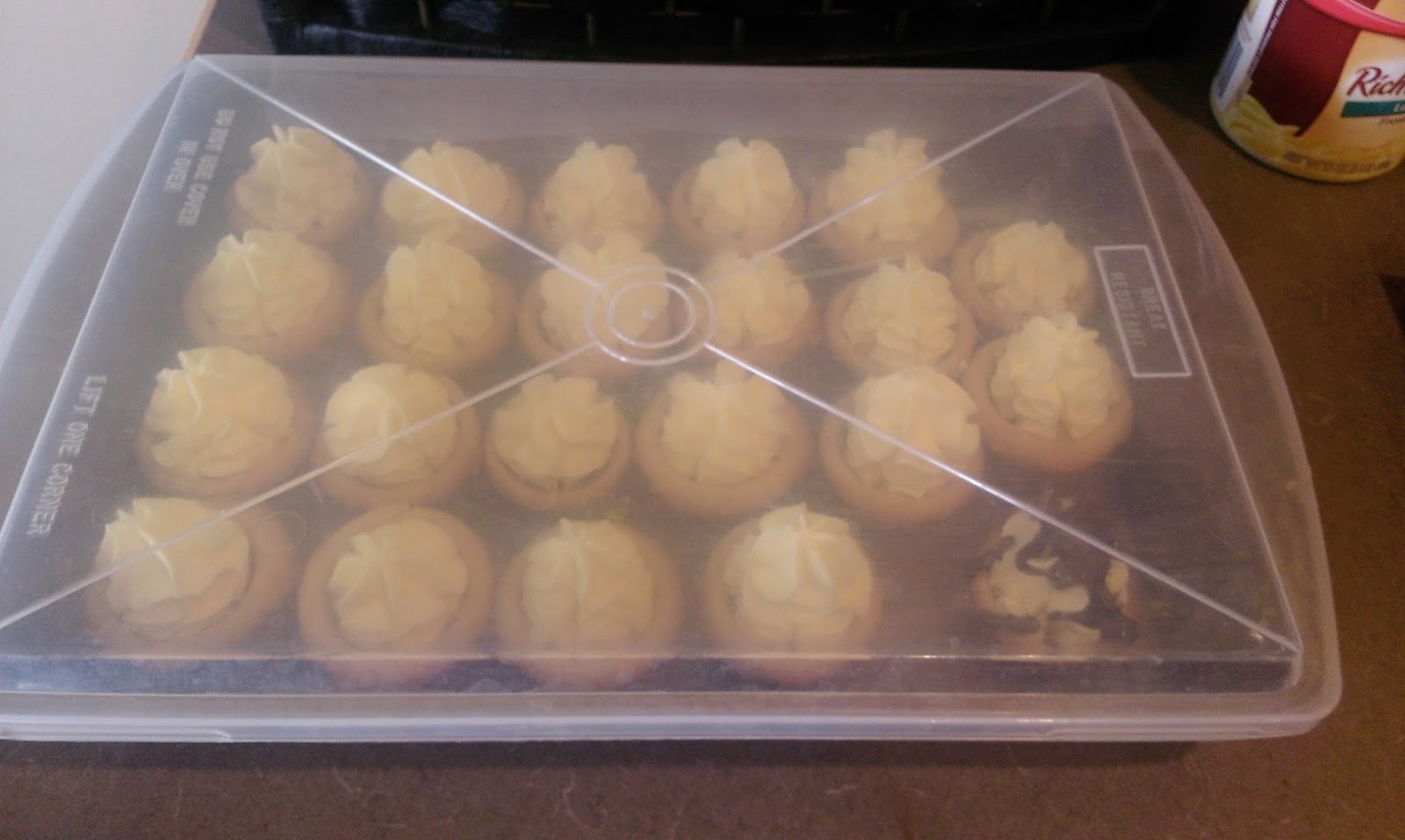 At this point, if you’re not going to eat all 24 at once, you’re going to want to refrigerate these. All that heavy whipping cream could get real bad real fast, and I’m emphatically trying not to give you salmonella via my blogs. Luckily, a 9×13 cake pan with a lid makes the perfect container: