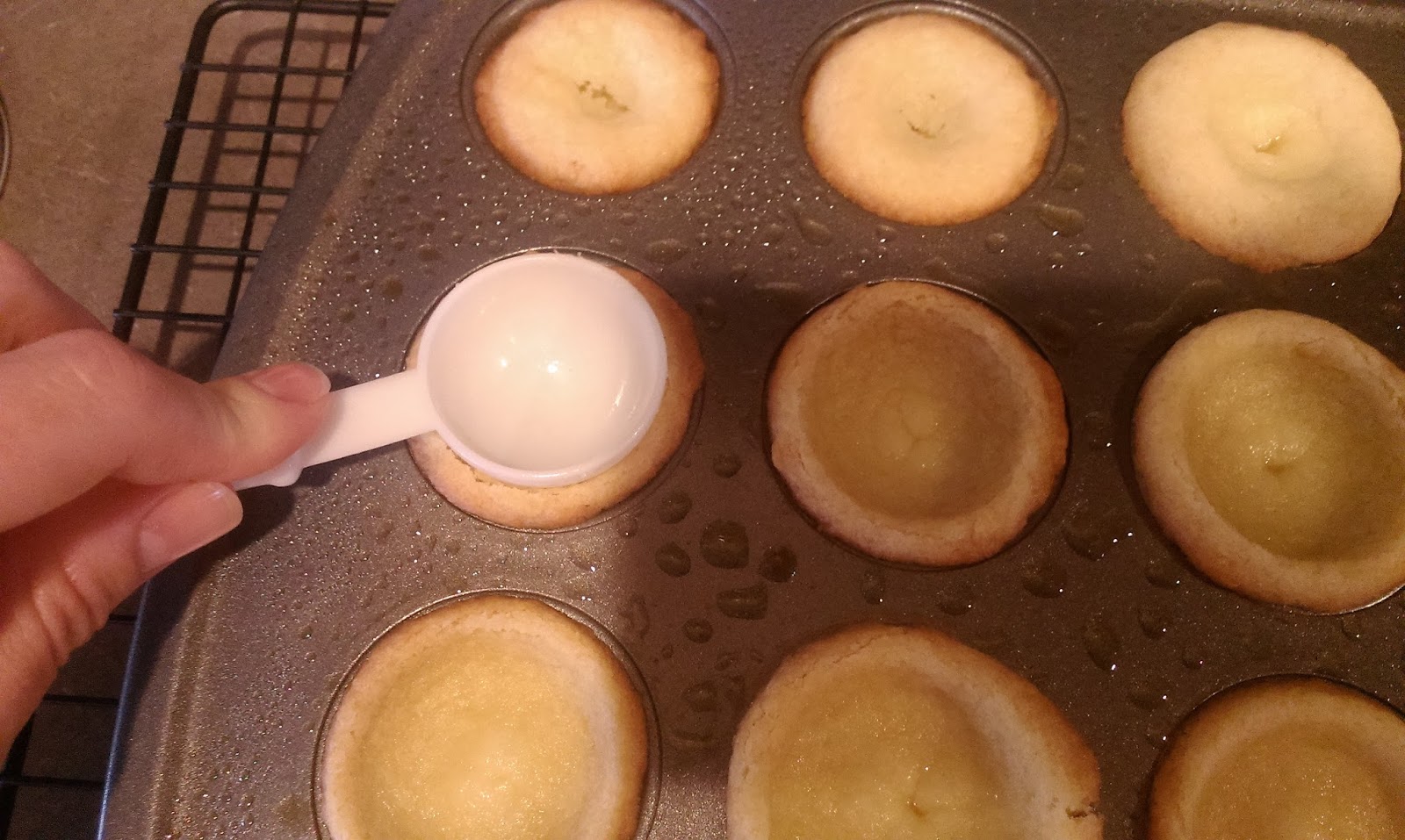Right away, place the mini muffin tin on a cooling rack and use your tablespoon to press the divots back into each cup…they puff up during baking. I had to go through and do this step twice to keep the formation of the cups.