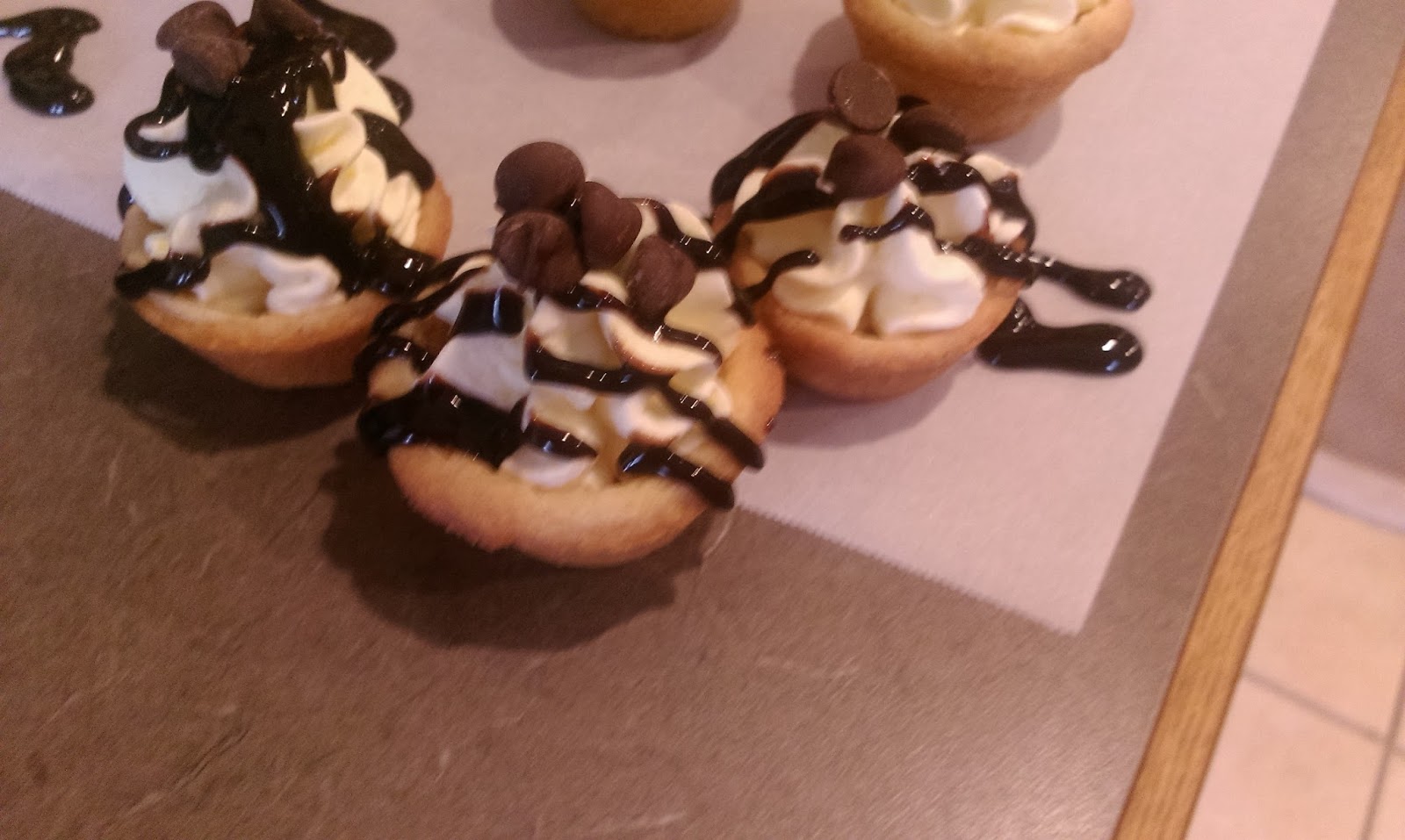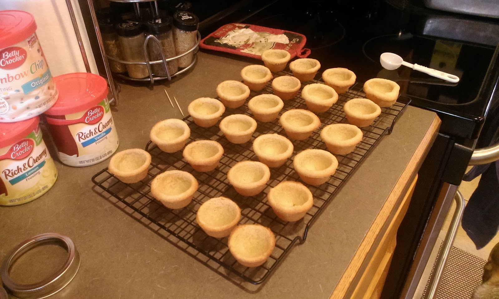 Let the cookie molds cool for a few minutes in the tin before removing to the cooling rack. If you happen to have three tubs of frosting on hand like I did, go ahead and eat one. These don’t take too long to cool. Side note, didn’t actually eat the frosting, but not because I didn’t want to…I promise I’ll tell you why I have thirty varieties of canned frosting in my next blog. When the cups are completely cooled, make the filling by dumping the whole pint of whipping cream in your stand mixer. Blend on low for a minute while the cream starts to thicken before bumping up the speed to super high for another minute…at this point, you’ll have a giant bowl of Cool Whip, essentially. Finish up by blending in the powdered sugar and packet of instant vanilla pudding.