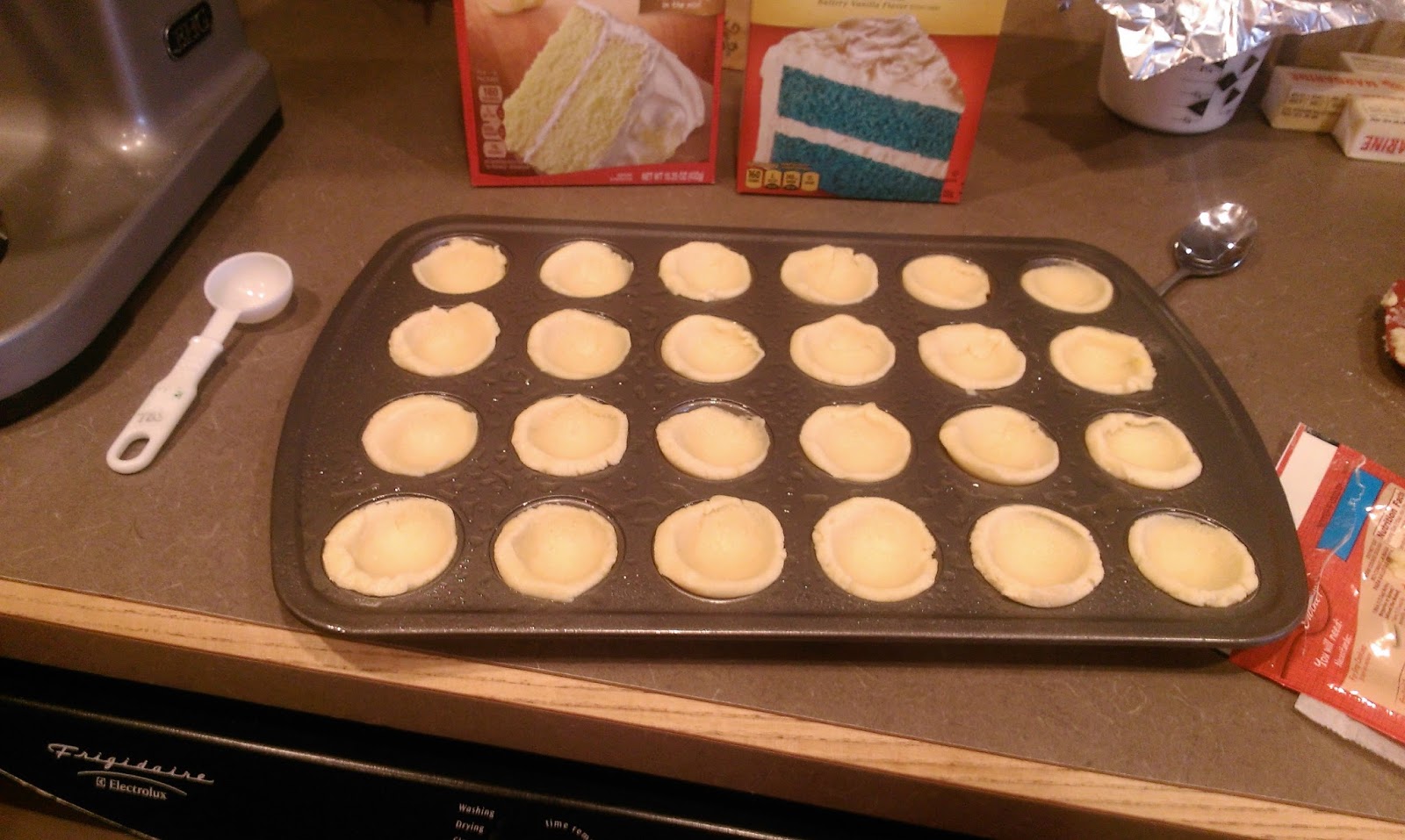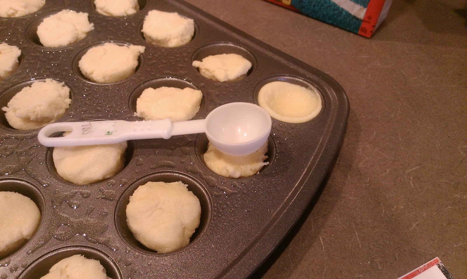 You’re gonna need to grease the ever-living crap out of a mini muffin tin and preheat the oven according to package directions (in this case, 375 degrees). Mix together the cookie mix, butter, and egg until well blended. Find a trusty cookie scoop, and make 24 scoops. Plop each scoop into the muffin tin. Take a tablespoon and make an indent in the top of each ball of dough: