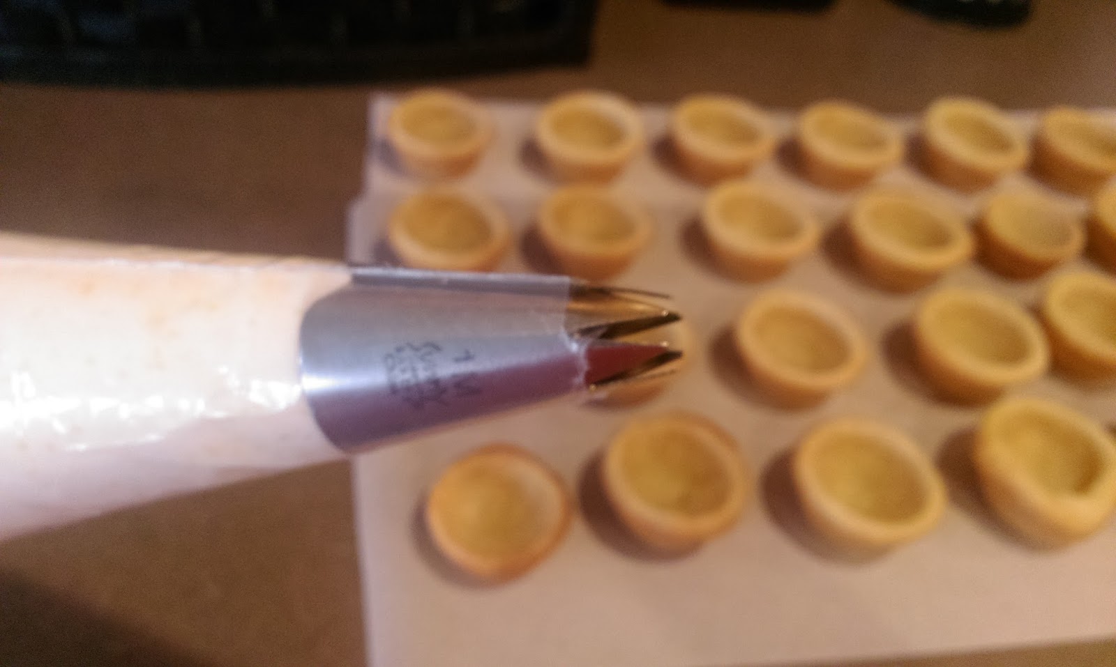 Load up a piping bag with the pie filling. Use whichever frosting tip you prefer, but I selected the 1M tip. I simply placed my tip straight down over the top of a cookie cup and piped a hefty mound of frosting into the cup. I had to refill my bag halfway through and still had a little filling leftover.