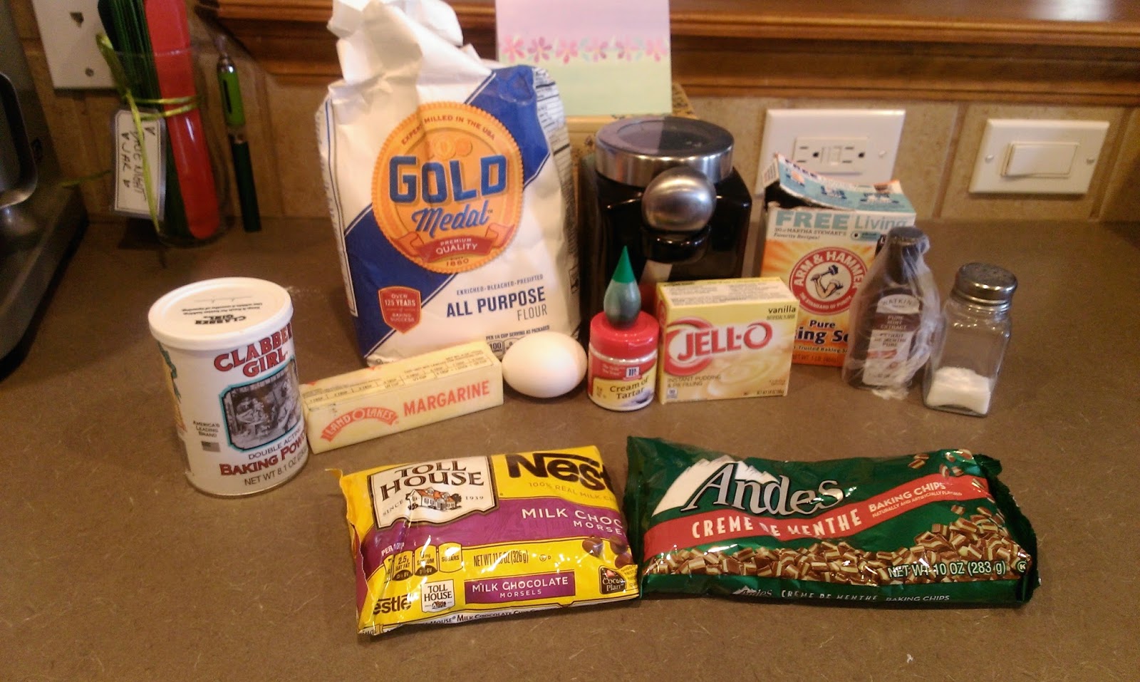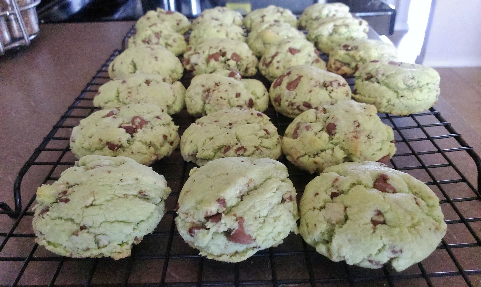 Start by preheating the oven to 350 and greasing a cookie sheet. Cream together the butter and sugar for 3-4 minutes until fluffy and Peep-like in appearance. Blend in the egg, food coloring, and mint extract. Scrape down the bowl before adding in the flour, dry pudding mix, salt, cream of tartar, baking powder, and baking soda and blending slowly until fully incorporated. Finish up by adding in the chocolate chips, blending slowly, and then the Andes chips, blending slowly.