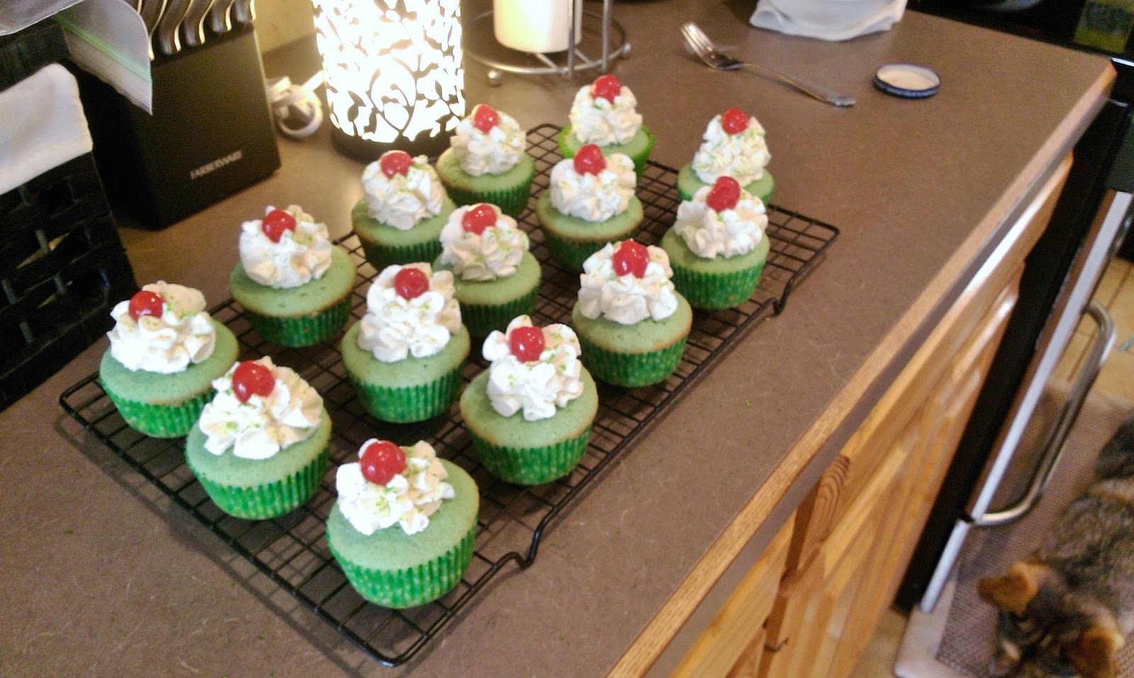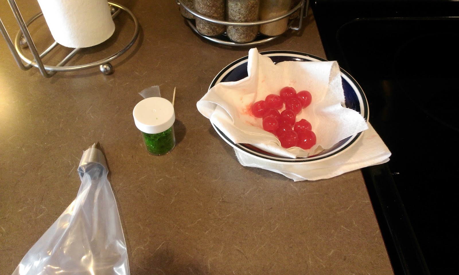 | Other awesome things you’ll need: cherries, green sprinkles, and a piping bag loaded with a 1M tip. |