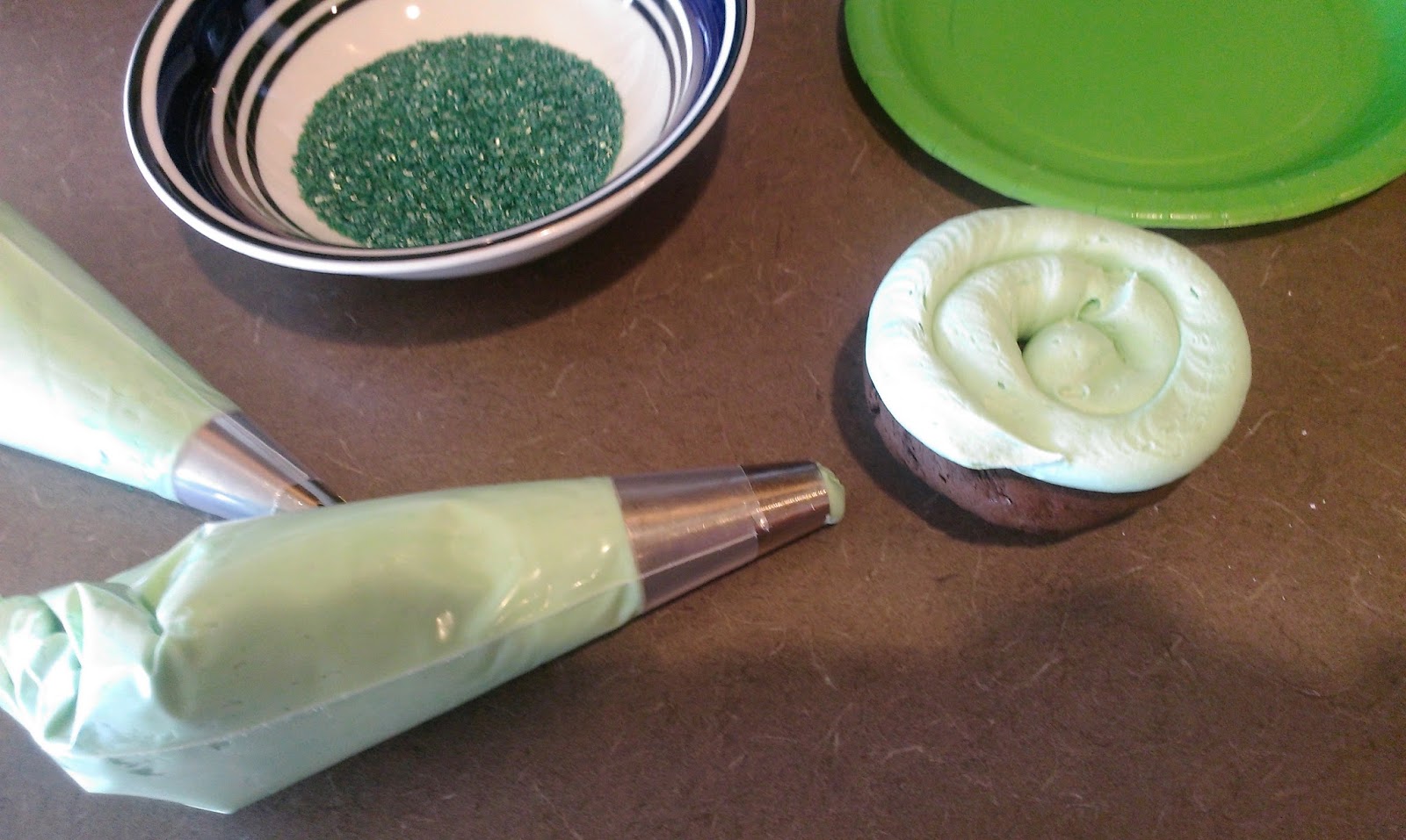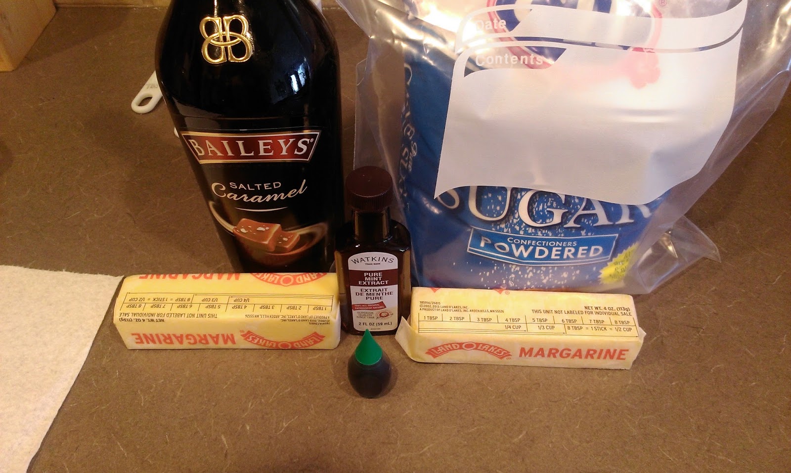 Cream the butter for a couple minutes before adding two cups of powdered sugar, the mint extract, and two tablespoons of Baileys. Blend well, scrape the bowl, and add two more cups of sugar and two more tablespoons of Baileys and blend. I like a stiffer piping consistency, so I added another cup of powdered sugar after this. Finish up by adding the green dye.