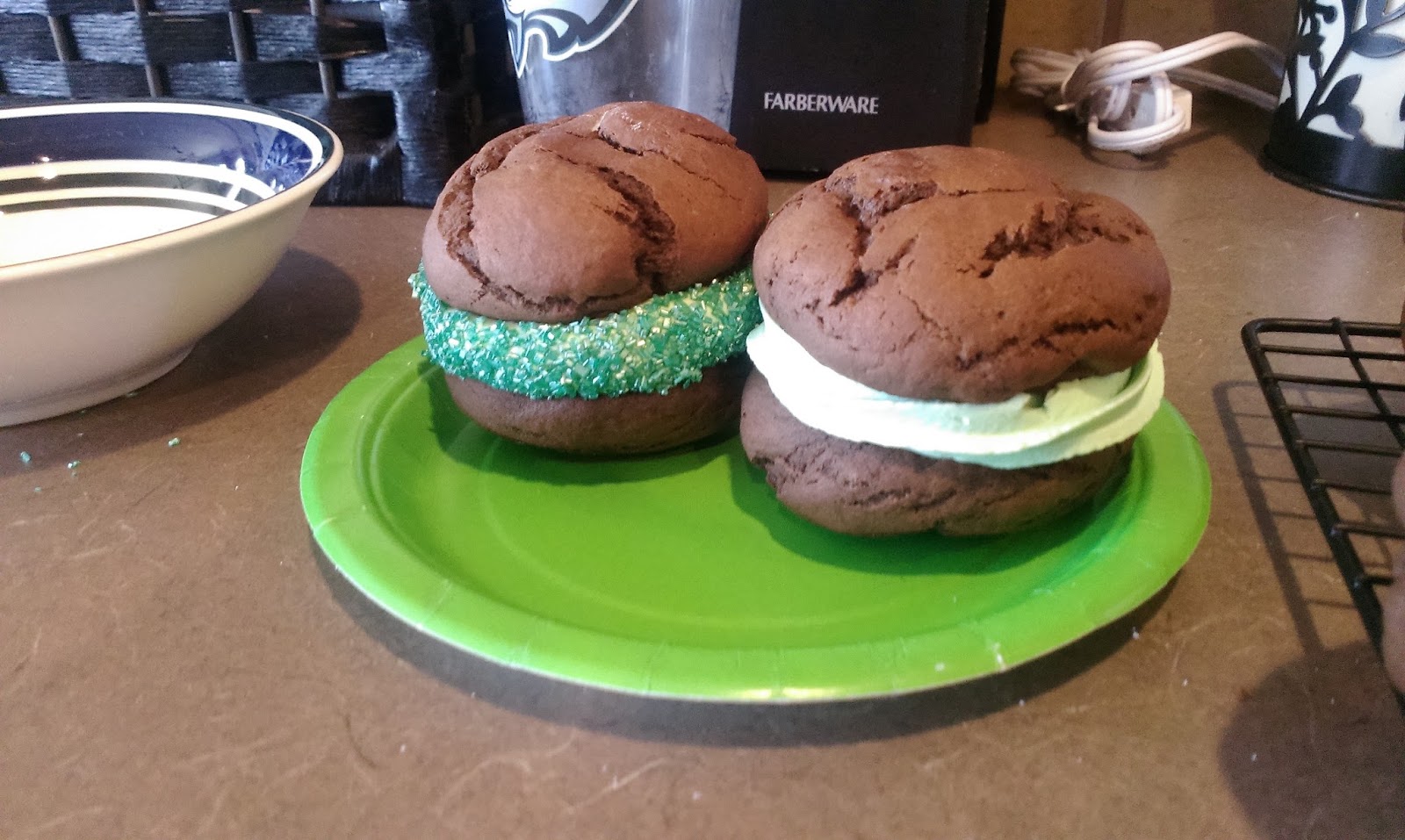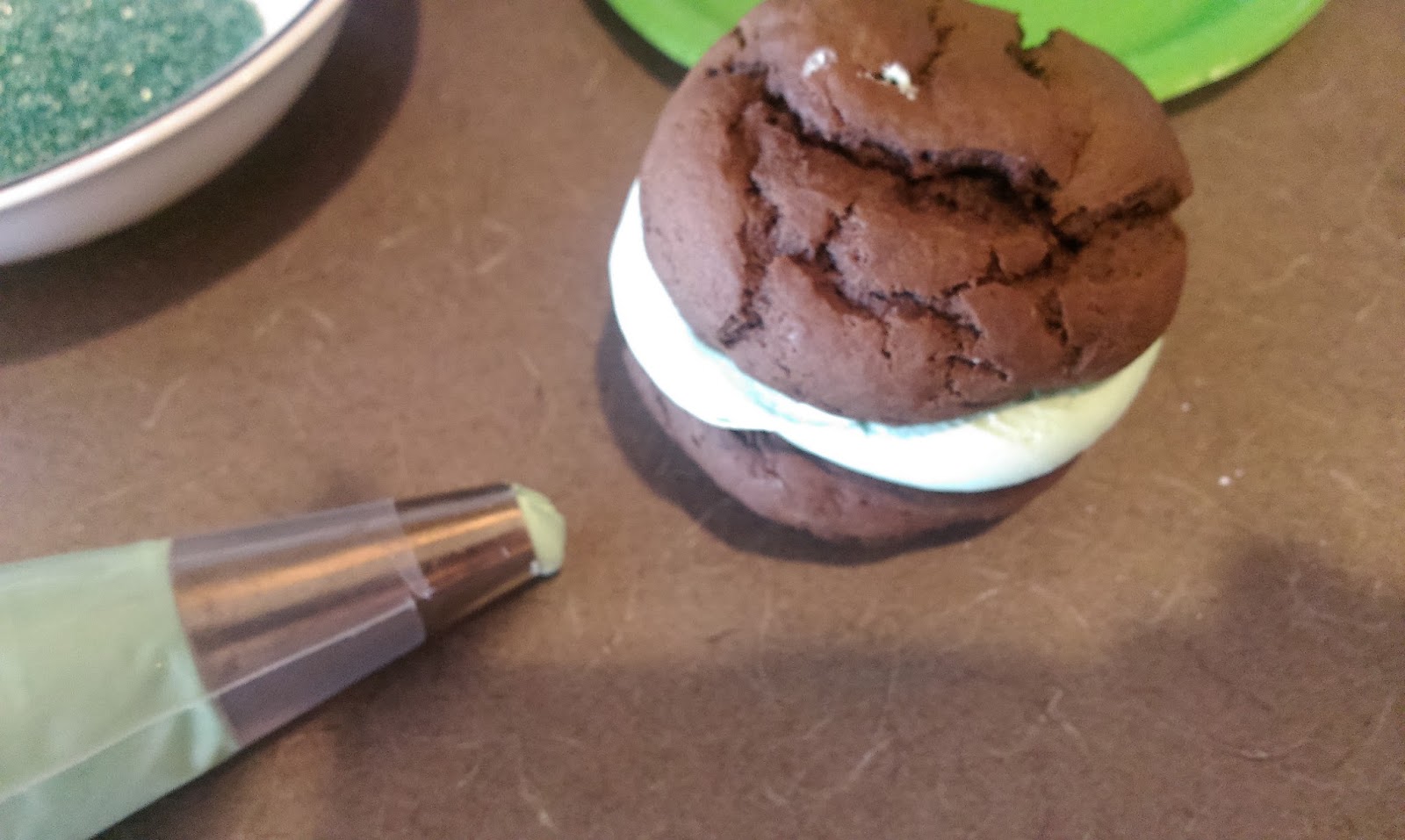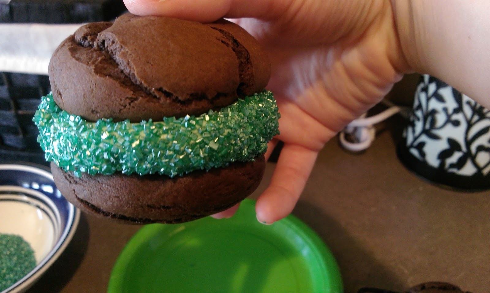 Then take the other cookie and gently place on top of the filling. You could leave things be here, but if you have green sprinkles, dump a bunch in a bowl and immediately after assembling a whoopie pie, roll the edges in the sprinkles to get a snazzy effect:
