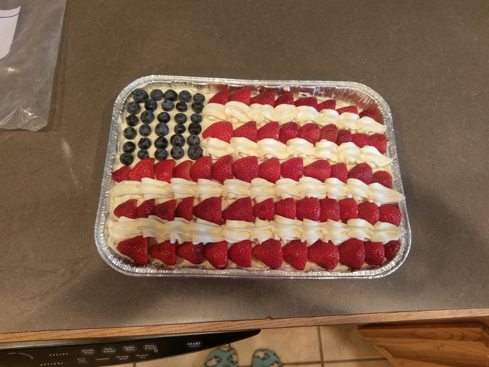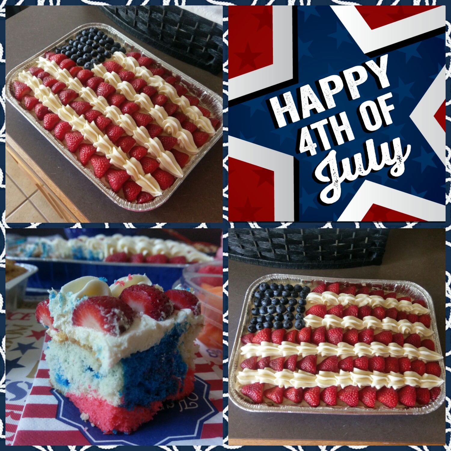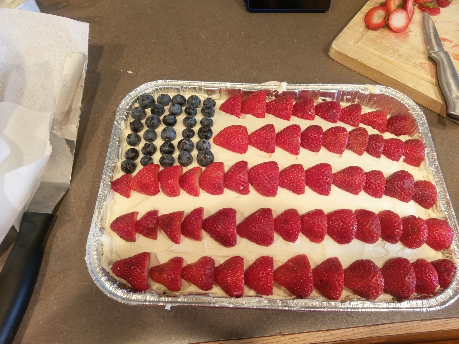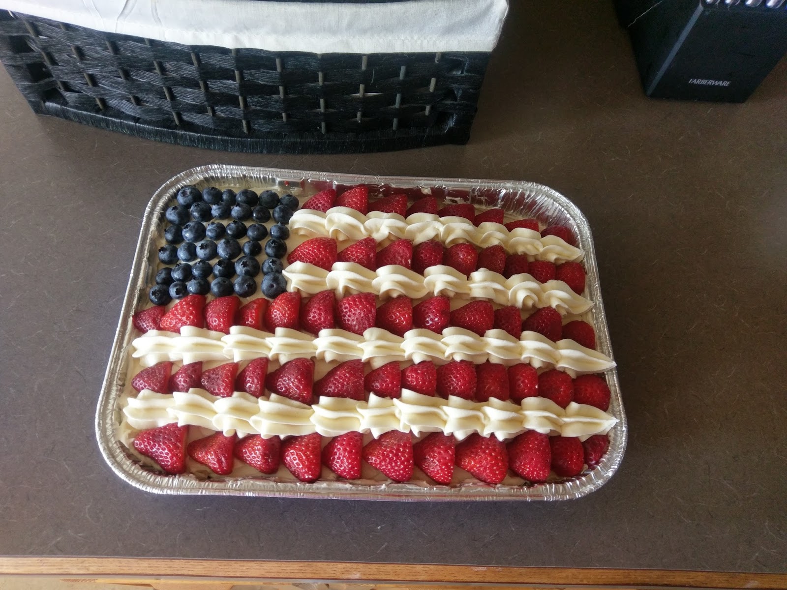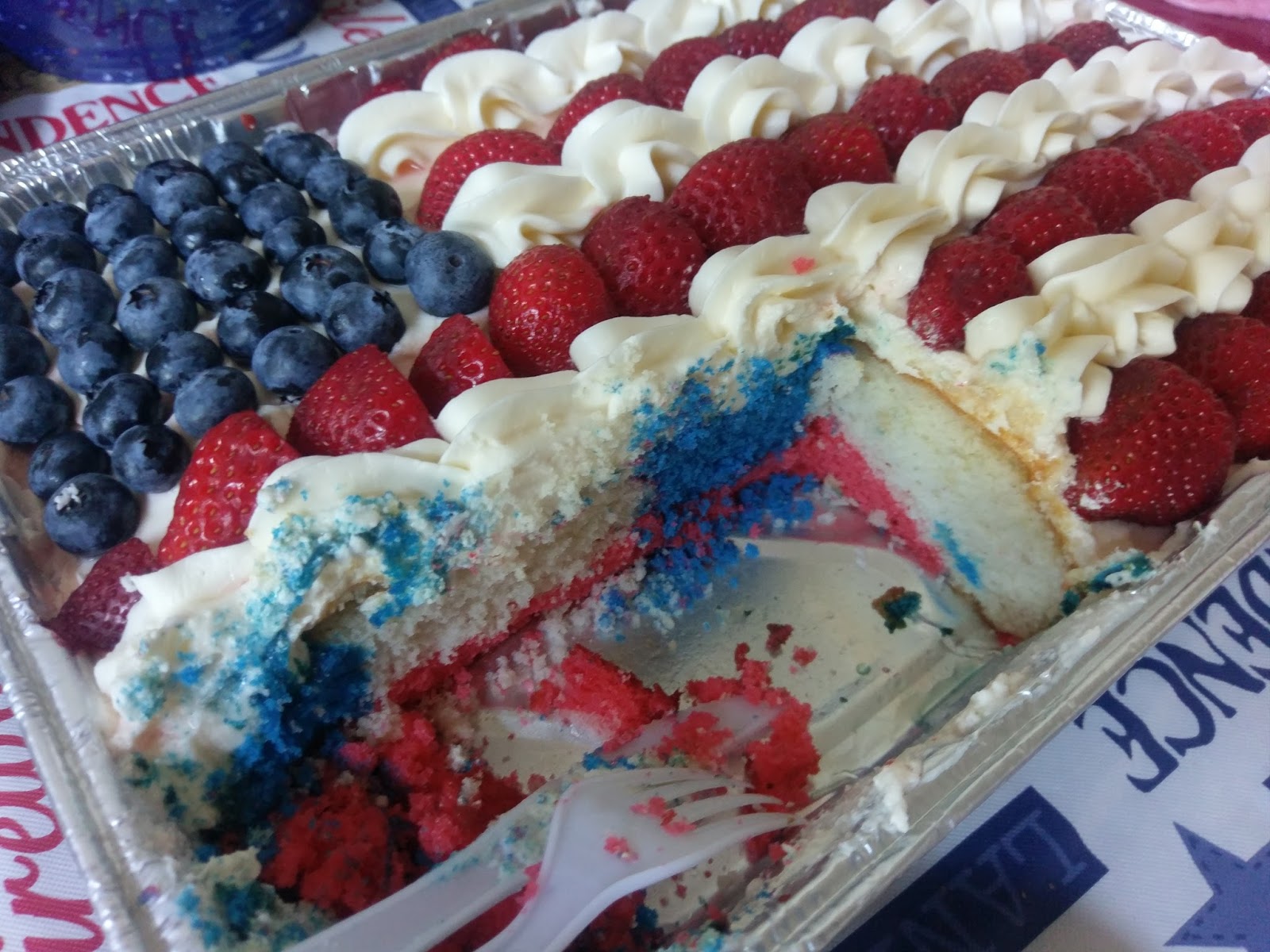I showed up at this party with an insanely American dessert and an equally insanely American husband. He loves this country, and he has amassed a wardrobe that shows it. From American flag bandana, tank top, sunglasses, board shorts, and USA face shield, the only thing he was missing was red, white, and blue flip flops…next year. But I’m pretty sure all of the Founding Fathers were impressed with his outfit, as were the party goers. On a scale of one to America, my husband really loves his freedom. I’ll admit it was a great conversation starter (the outfit, not the cake), and being the wife of the most American to ever America did fill me with a lot of pride. It may look difficult to assemble, but I had this bad boy ready to go in under two hours (the cake, not my husband). Minus wait time for the cake to cool, this was so insanely quick to assemble. I recommend bringing this to all your celebratory barbecues tonight and tomorrow if you’re in need of a dessert. If he could, Ben Franklin would totally high five you for making a dessert this patriotic, and you know it.