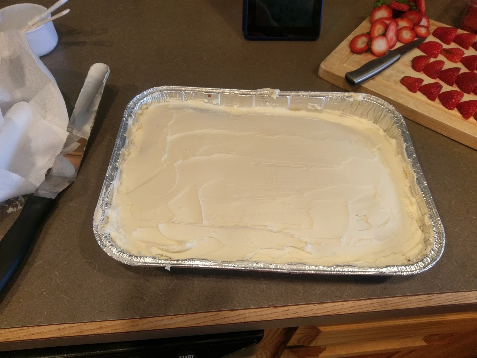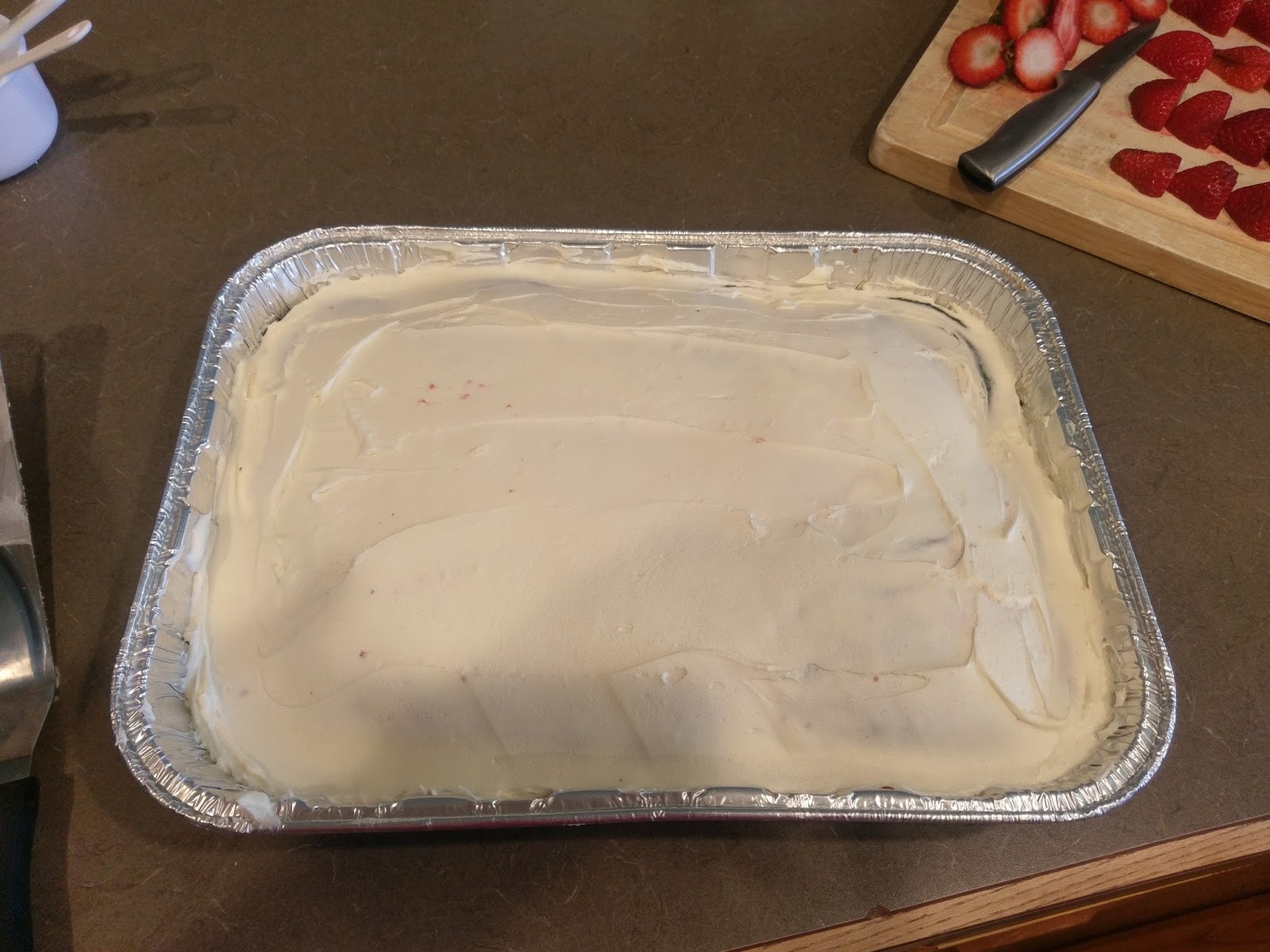 | While this is taking place, go ahead and cut a bunch of strawberries in half. I ended up using 3/4 of a 2 lb container. |