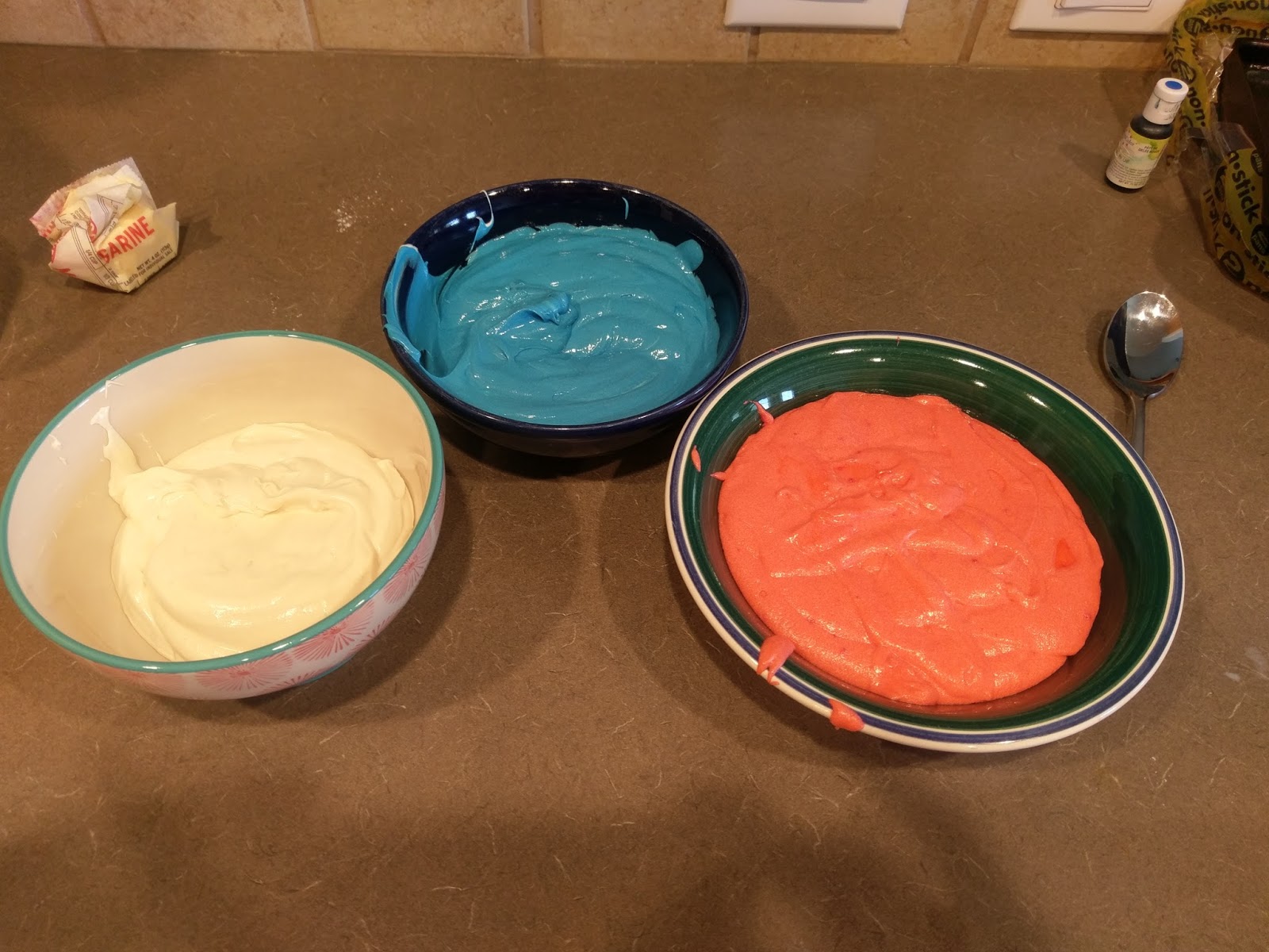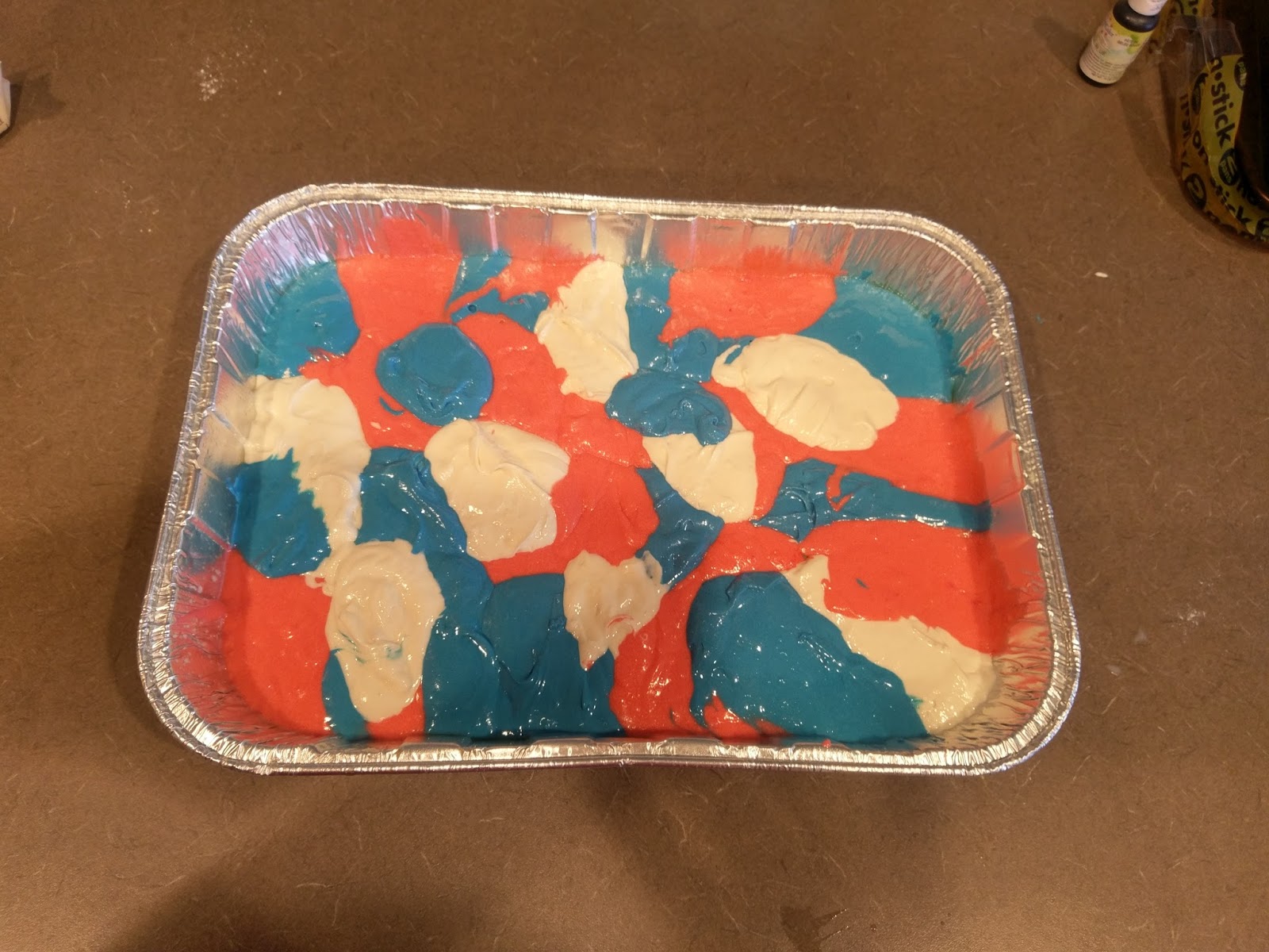 | Then gather up three spoons and plop a spoonful of each color into the pan in random order. |