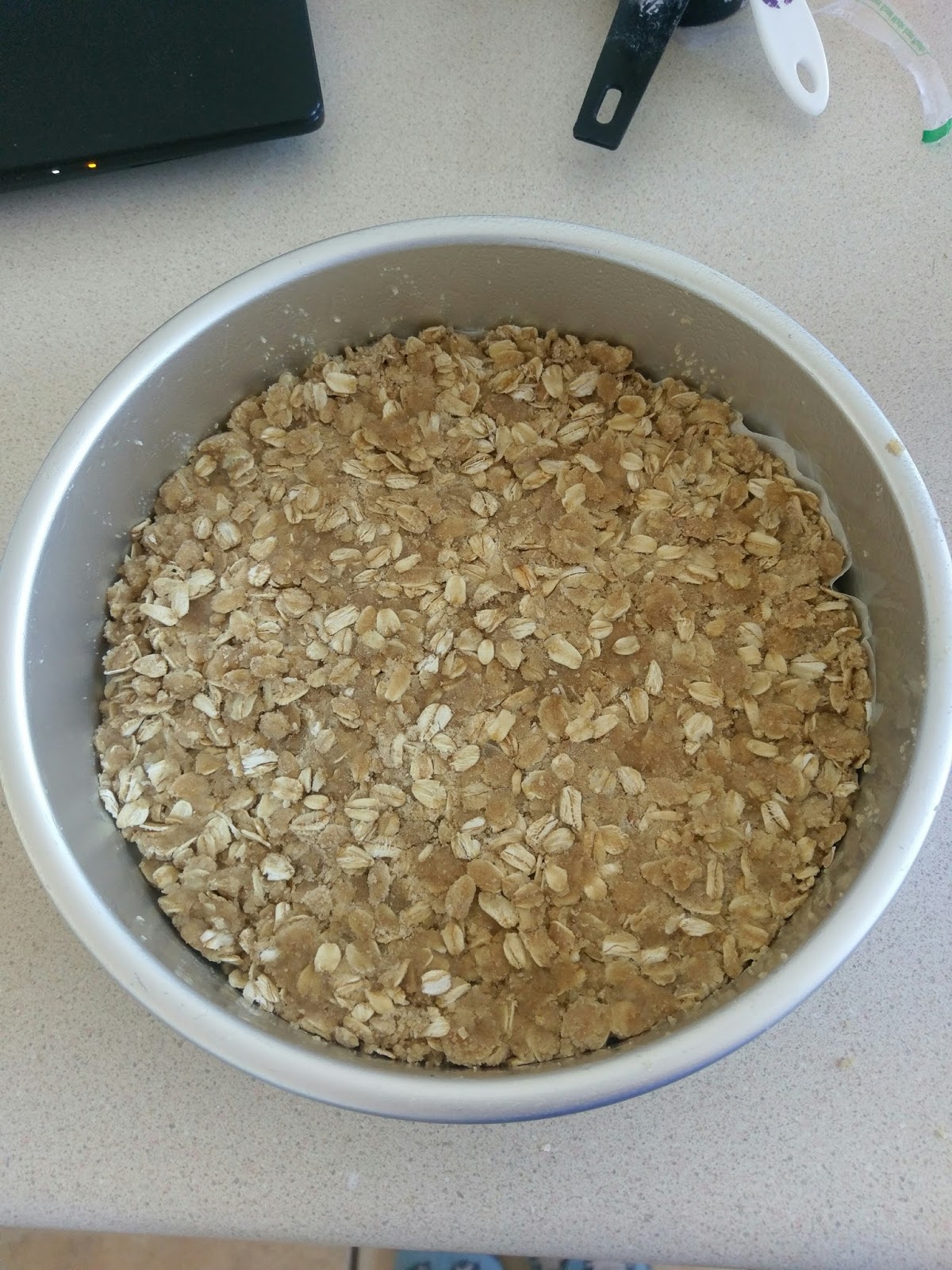 Start by preheating the oven to 375 and line an 8×8 round or square pan with Parchment paper and spray with cooking spray. In a large bowl, mix the oats, flour, brown sugar, salt, and ginger together. Once combined, add in the melted butter and mix until all ingredients are damp. In a small, separate bowl, mix together the cornstarch, lemon juice, and sugar and set aside.