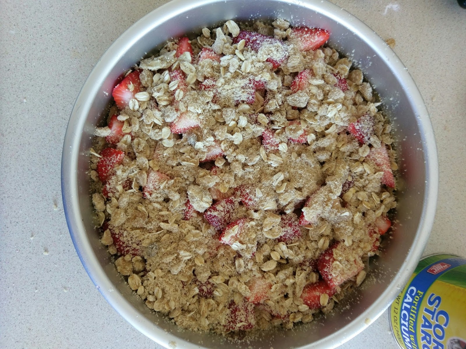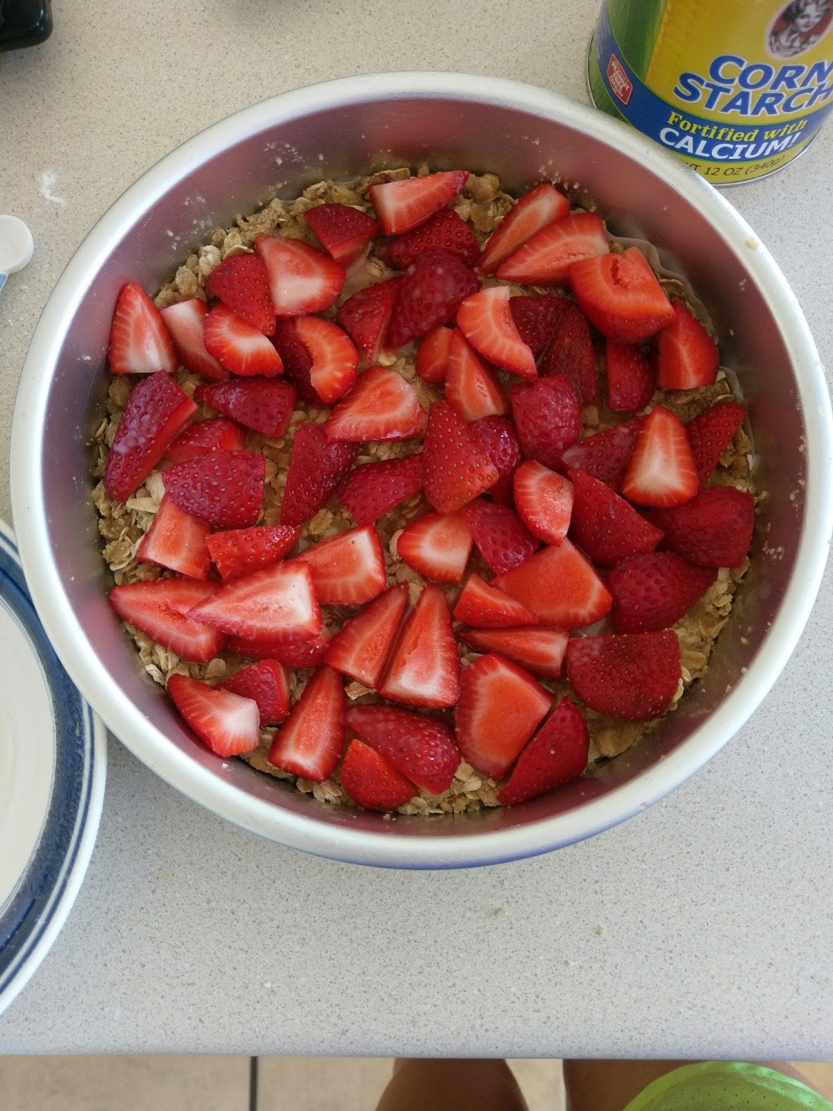 | Top with the chopped strawberries. Then take the bowl of lemony sugar and pour over all the berries. |