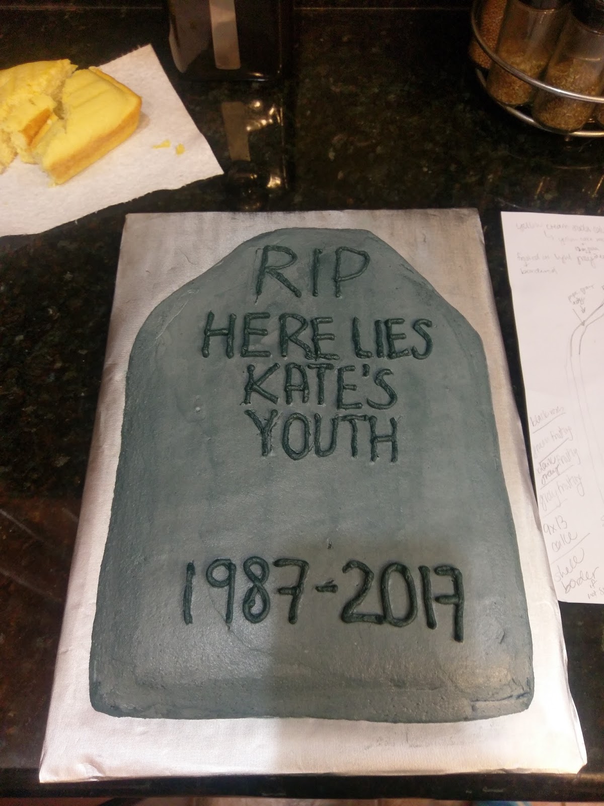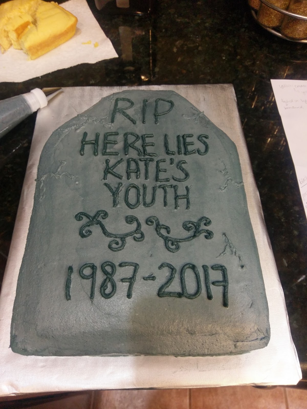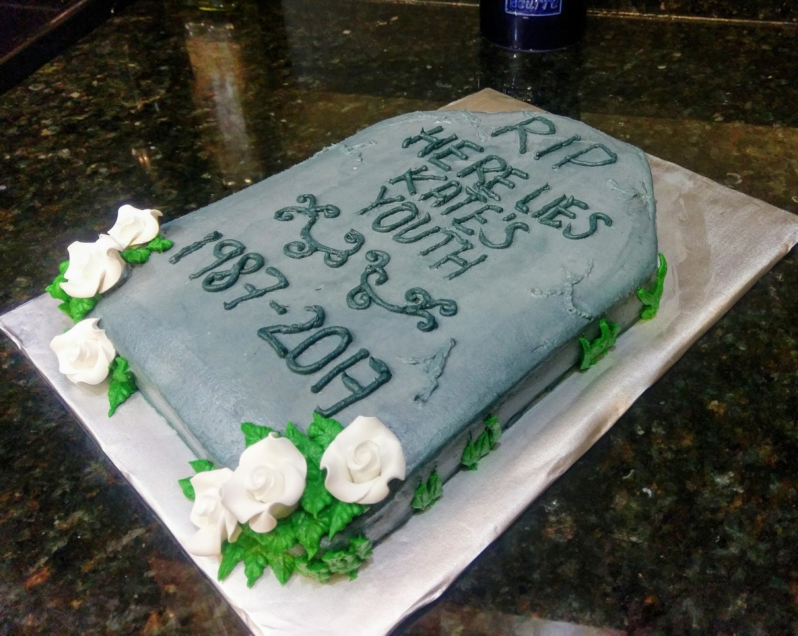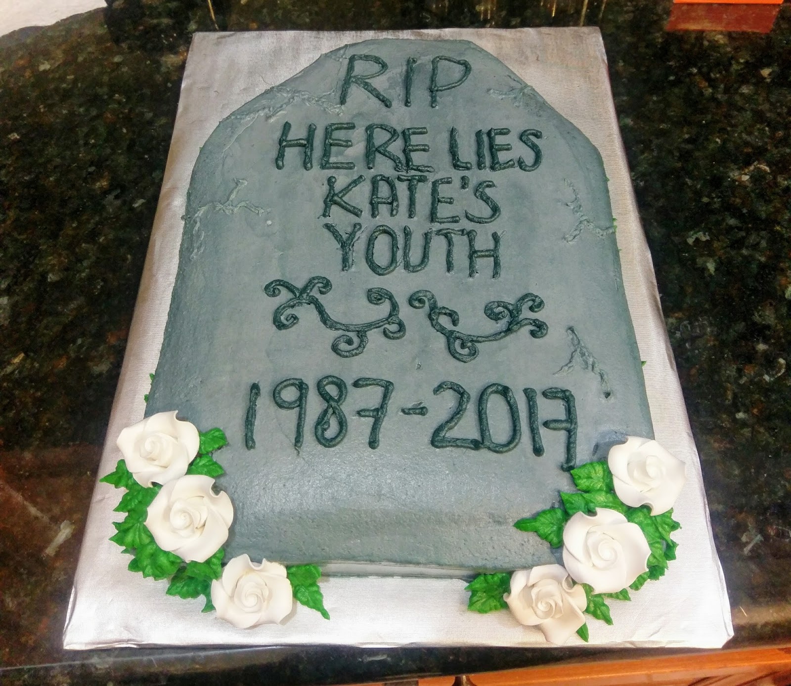 Imagine my surprise when I awoke the morning of my thirtieth birthday to find my hair had not turned completely gray, my girls were not sagging slightly above my navel, and my retinol creams were still working at keeping evil wrinkles at bay. After several brief once overs in the mirror (a typical morning for my level of narcissism) and a realization that it was definitely time to touch up my roots, I accepted that I’m okay with turning 30 as long as I still look 29. Much like a child who finally succumbs to taking a nap after spending an awkward and annoying amount of time resisting, I too have have stopped fighting the fear of turning 30. I spent my early twenties being a total hot mess of blonde hair and really poor fashion choices (ugh, mid 2000’s trends–looking at you body glitter), and my mid-twenties cultivating who I wanted to be when (or if) I finally grew up. So now I actually get to be that adult. Or adult adjacent. I still laugh at fart jokes and wear ridiculously fuzzy and usually unmatching socks, so some parts of me will always maintain a youthful jubilance. But once you’ve been regularly filing your own taxes and held a mortgage payment and non food service related employment, it’s simply time to realize age is not really the number itself, but how you feel. Kind of like mileage on a car–there’s city miles versus highway miles, and while my city miles may be racking up, my highway miles are barely registering. And even though I had this enlightening epiphany about age and life, I’m still insanely self-deprecating and needed to make a birthday cake to poke fun at the moratorium on my 20s. I’ve literally been planning this cake since the moment I turned 29, and now that I’ve done it, I can clearly say I put up a damn good fight while finding the most morbidly original way to deal with the death of my youth: