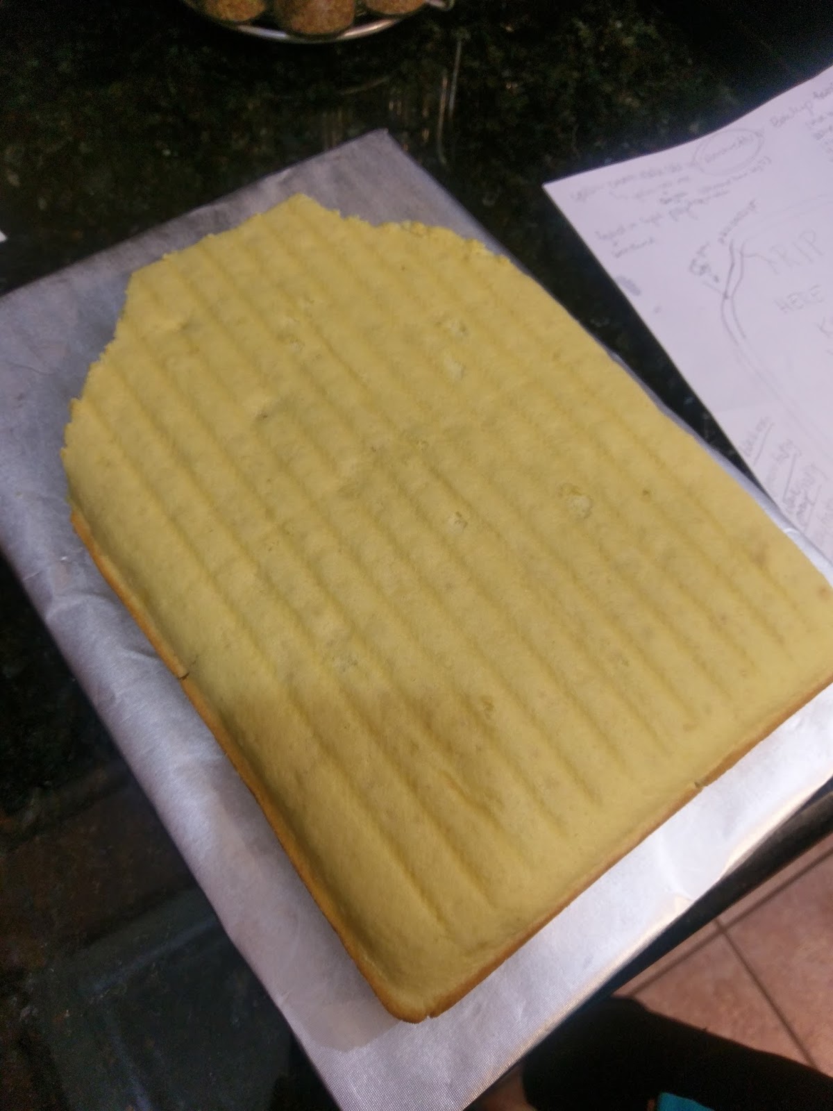 | Note to self, use thicker towel on cooling rack to avoid dreaded cake lines. Take your cooled cake and trim the edges to achieve a tombstone shape. |