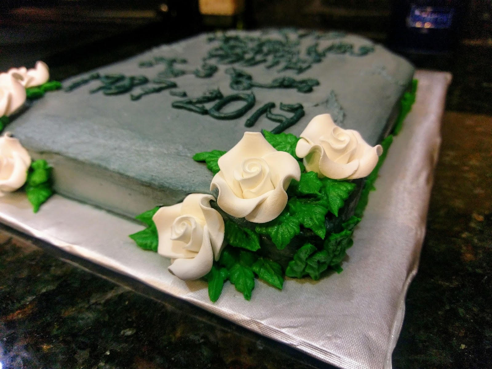 | Use the rest of your green frosting to create blades of grass and leaves on the sides of your tombstone. Use the same technique, just pipe UP the side of the cake instead of out. |