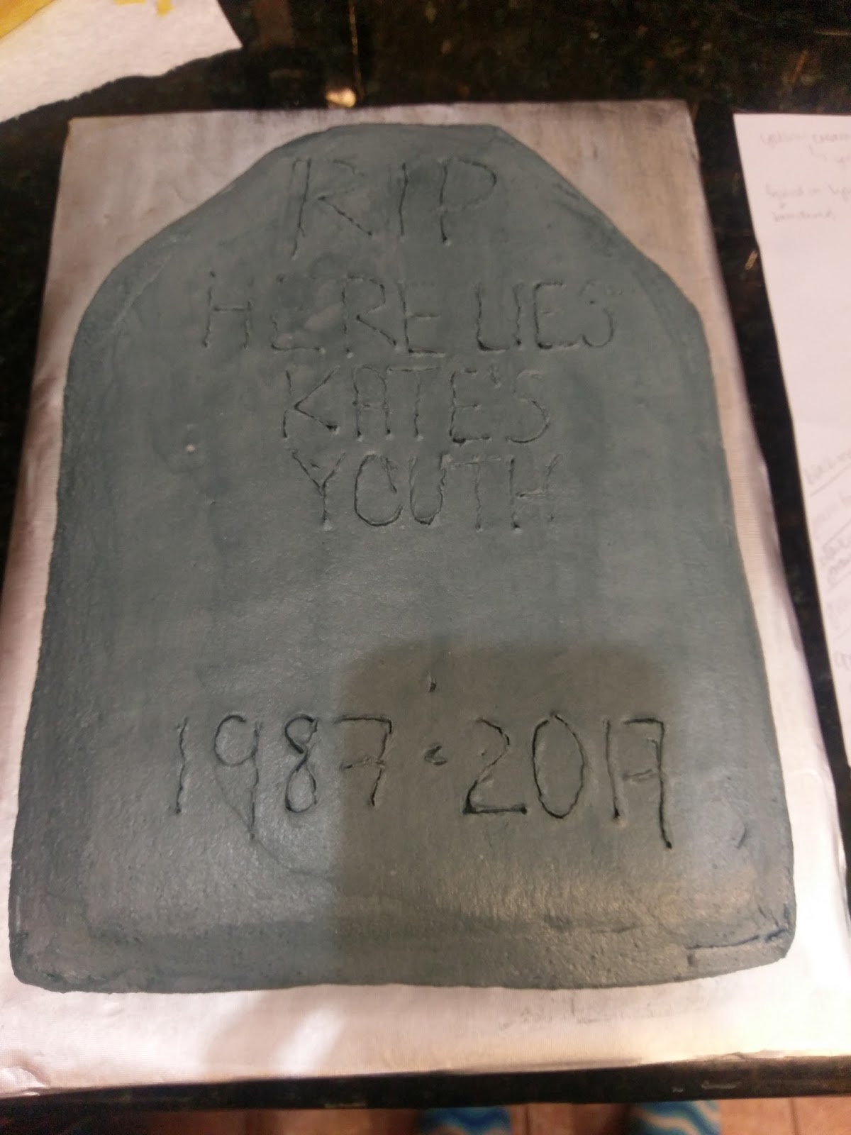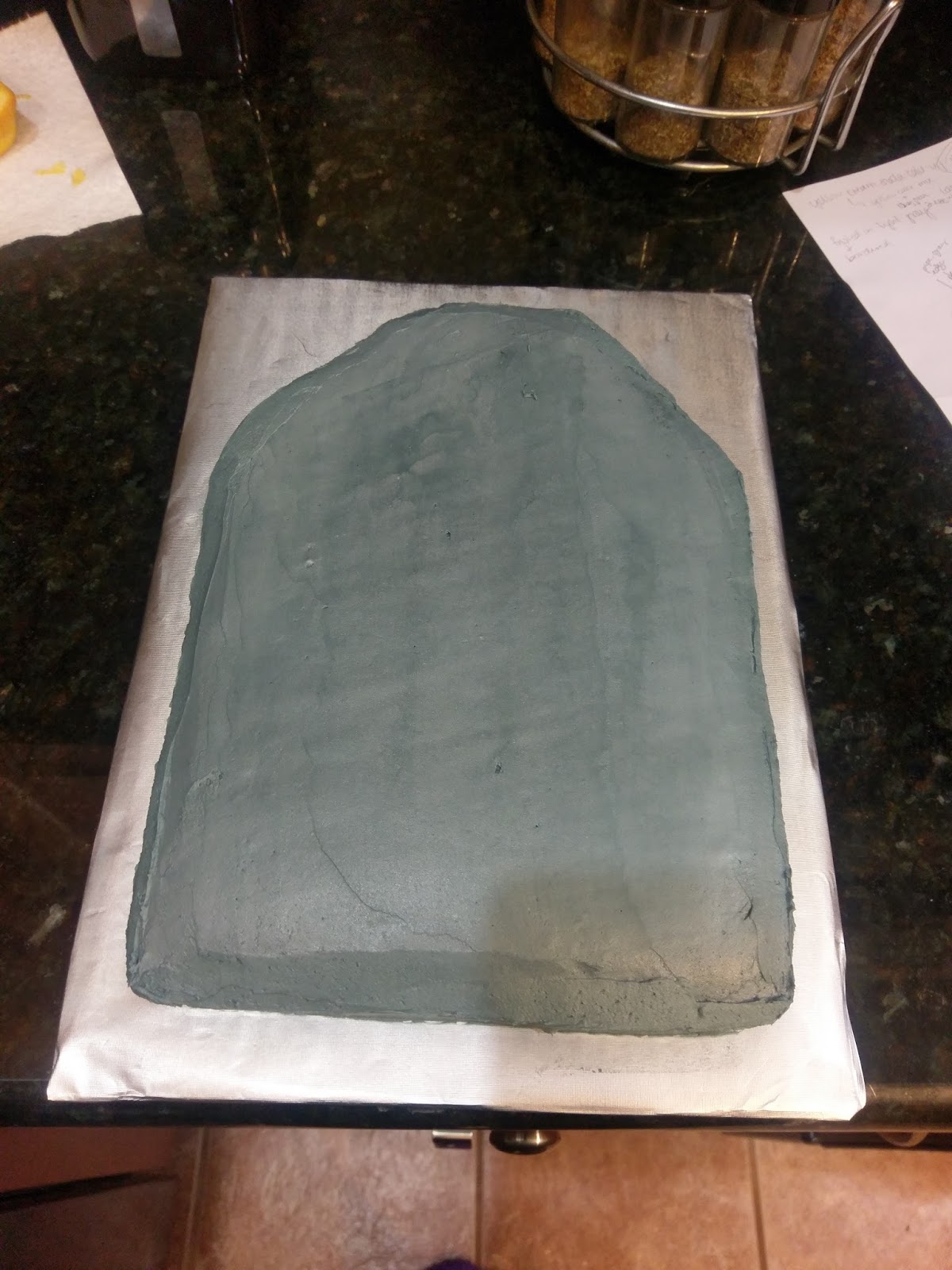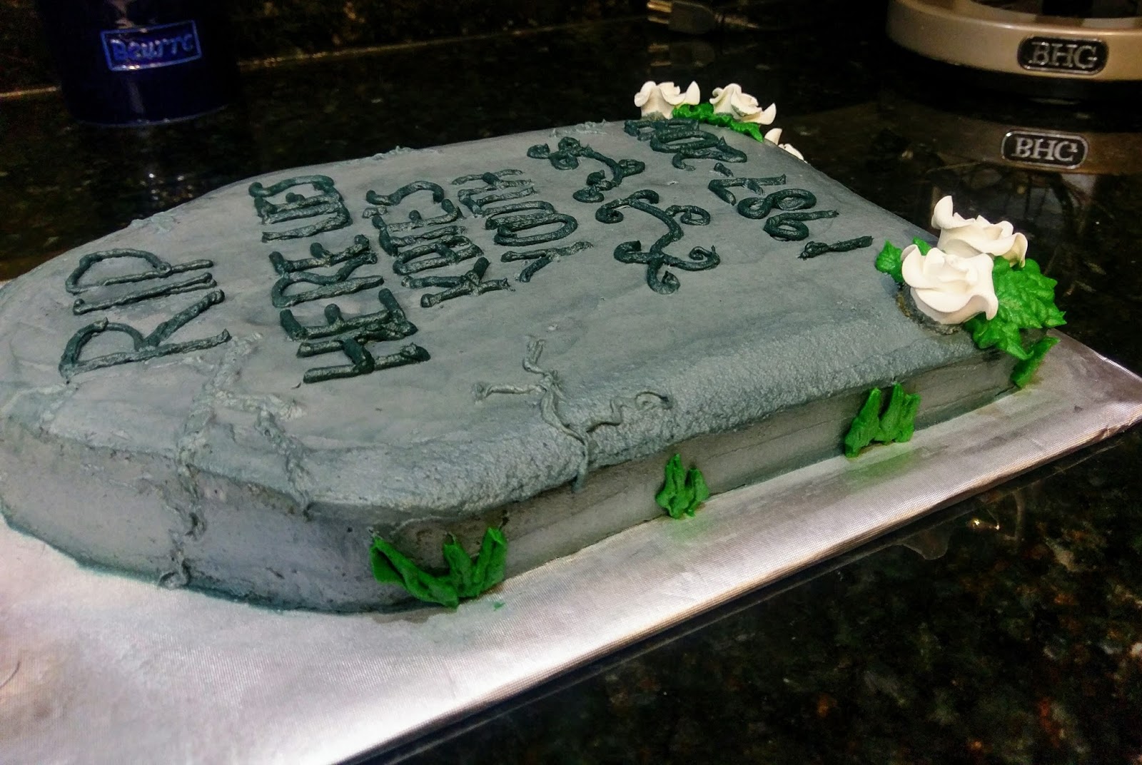 | Using the heated spatula trick, add a final thin layer of frosting. Let set in the freezer for 15 minutes, and then use the Viva paper towel trick to smooth out your frosting. But honestly, keep it a little messy. It’s a tombstone, so you want it to look a little rough. I mean, if your cake looks like a tombstone from the Middle Ages, keep smoothing. Think Roaring 20s gangster tombstone–slightly riddle with holes but not entirely dilapidated. |