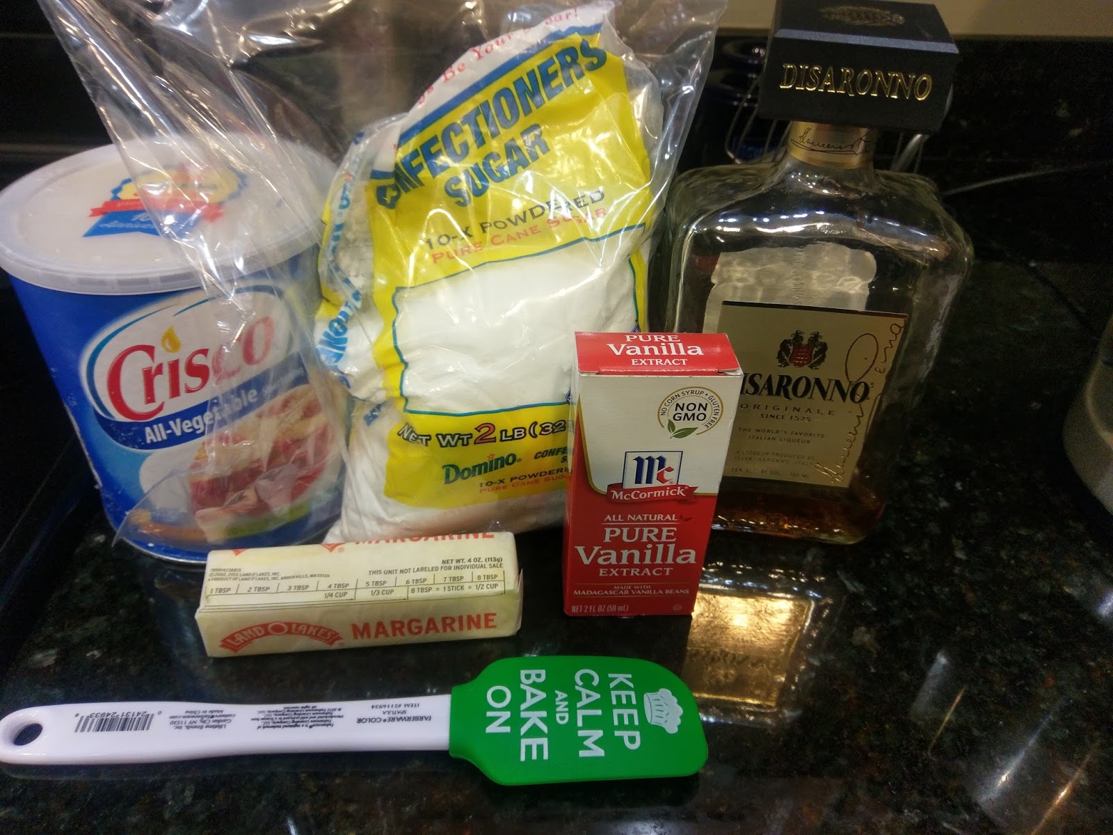 You could cut this recipe by a third and probably still have a little leftover. But blend the butter and Crisco until well mixed and then add in the vanilla, half the sugar, and half the Disaronno. Blend well and add in the rest of the sugar and Disaronno until you get a smooth consistency.