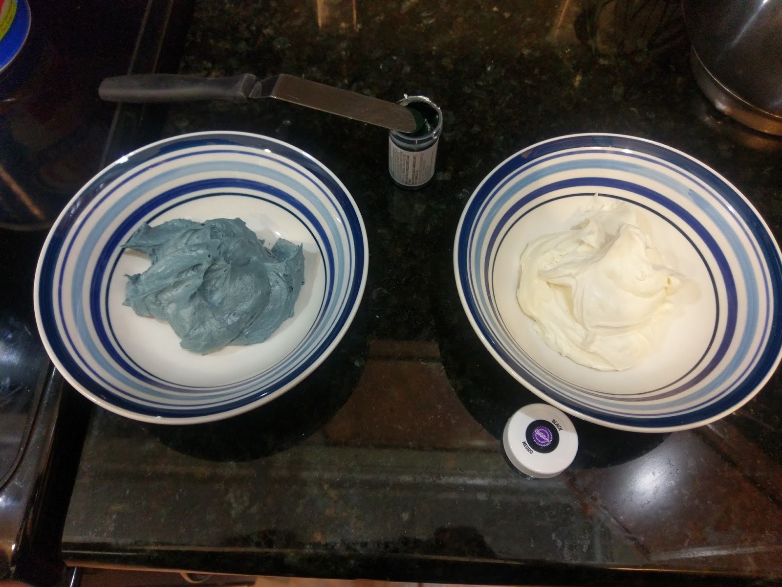 At this point, get out two small bowls and add about a heaping 1/4 cup of plain white frosting to one of them. Now, dye the remaining frosting still in the stand mixer gray by adding a dollop of black gel dye until you get the shade of gray you like. I didn’t use much at all. Then take another heaping 1/4 cup of the gray dye and plop it into the other bowl. Add another smidgen of black dye to this to make it a shade or two darker than the base frosting. This will be for the tombstone’s engraved message. Cover these two bowls with dampened paper towels, and get ready to be slapped in the face with another montage!