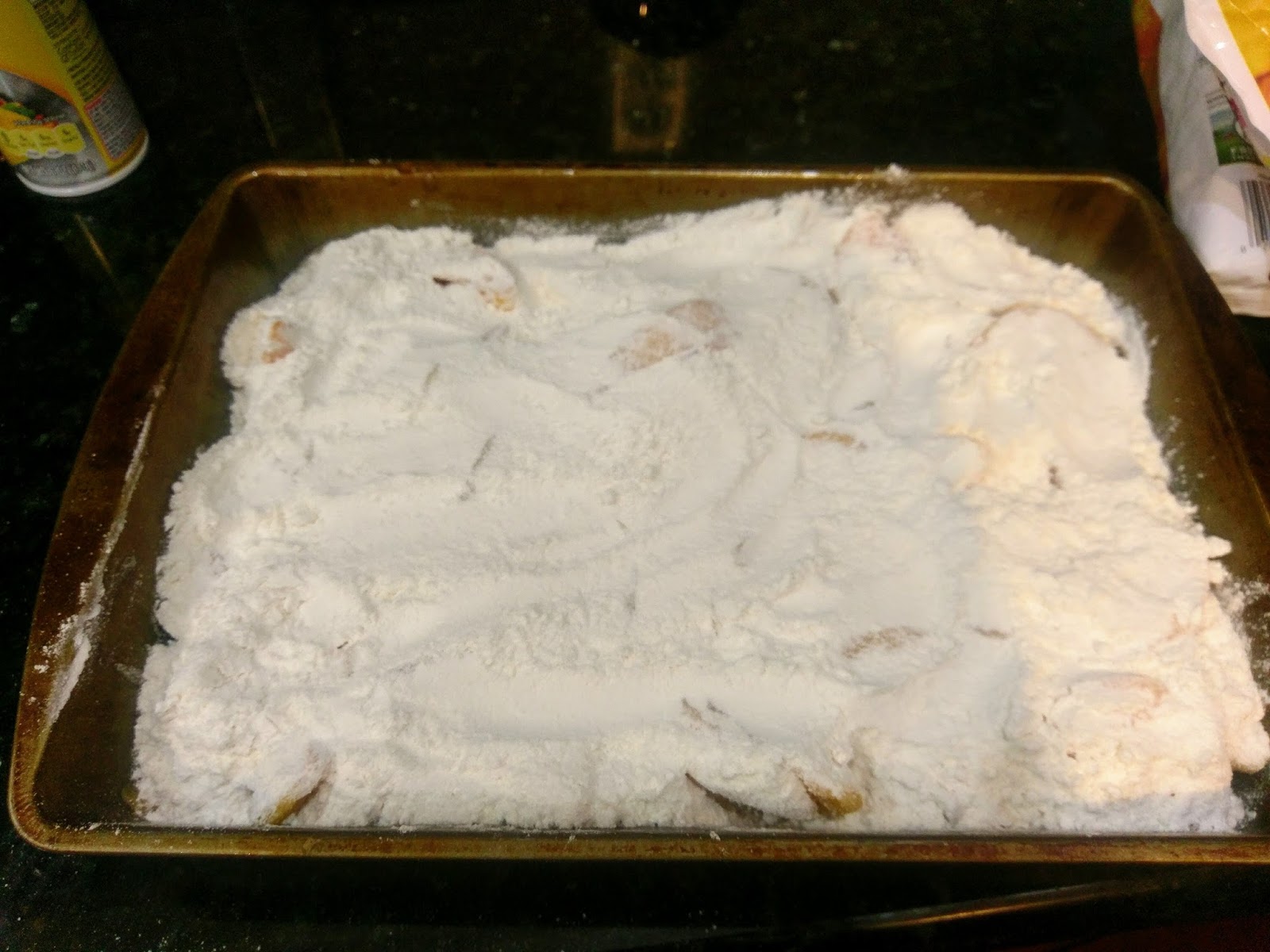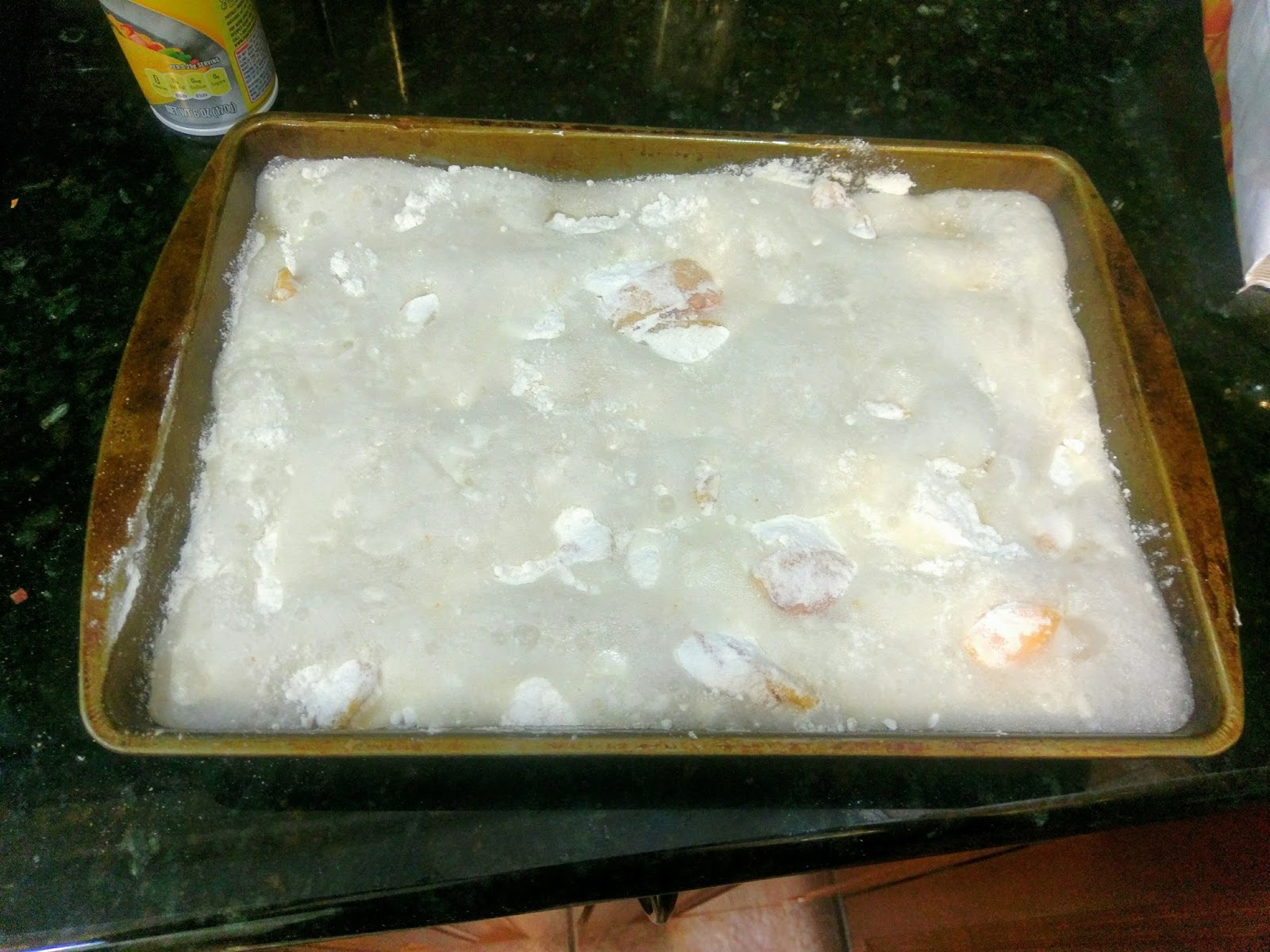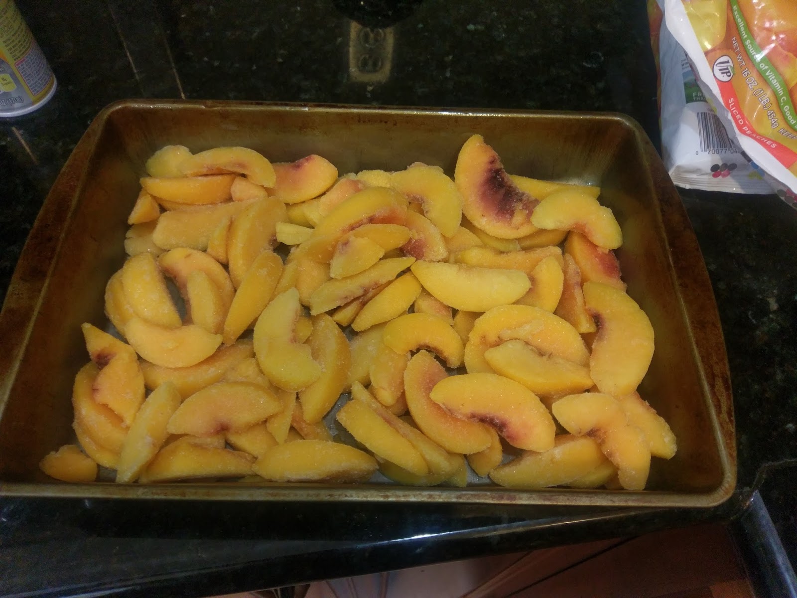 While your oven preheats to 350, grease a 9×13 baking pan. Take both bags of frozen peaches and dump into the pan. Try to spread these out to form even layers without any empty spaces.