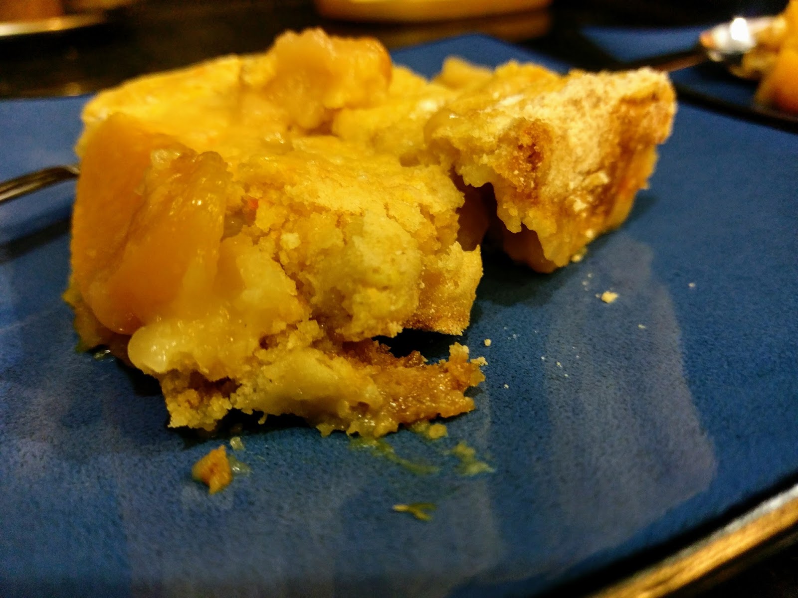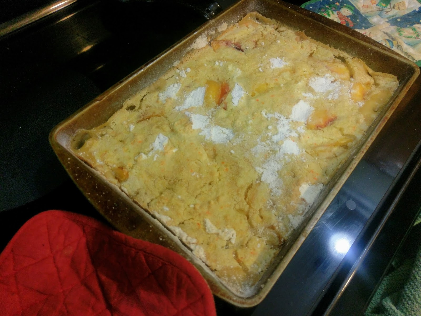 I decided to be supremely lazy and dump the cake mix on top of the peaches with a few dusting motions of the open cake mix bag. Later, I decided I should have mixed together the soda and the cake mix first to ensure even baking. So don’t be Kate-lazy. Mix the cake mix and the soda together in a bowl and then pour it evenly over the peaches.