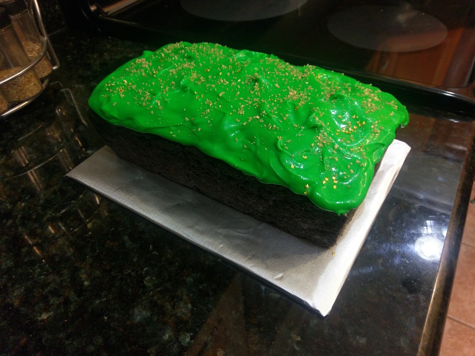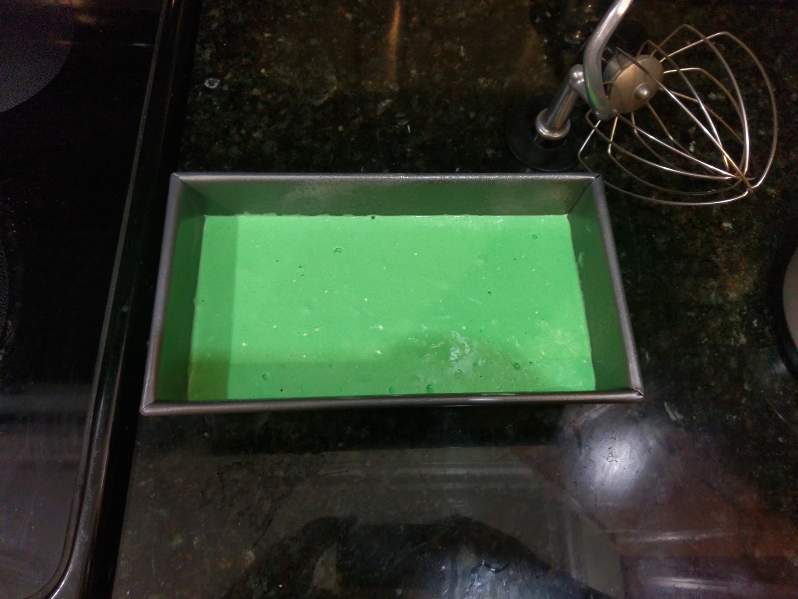 This 10×6 pan was not the right size loaf pan for my green cake. When my cake baked, it was shorter than my shamrock cookie cutter. Since every Pinterest tutorial ever told me, “Oh, just cut your cake into loaves, and place your cookie cutter into each loaf to cut out the shape,” Kate Panic Stage One (also known as the “I’ve made a huge mistake” stage) began immediately upon noting the first loaf I cut only came halfway up the height of my cookie cutter. To prevent your very own personal panic stages from commencing, use a pan that’s going to give you more surface area to cut into, like a 9×13 pan, a jelly roll pan, or maybe even a 9×5 loaf pan that would bake up higher. Grease your pan of choice and dump your batter in. Bake for the required amount of time the box states, give or take 5 minutes. When I bake with soda, my cakes always seem to finish up 3-5 minutes before they would with the standard butter and milk.