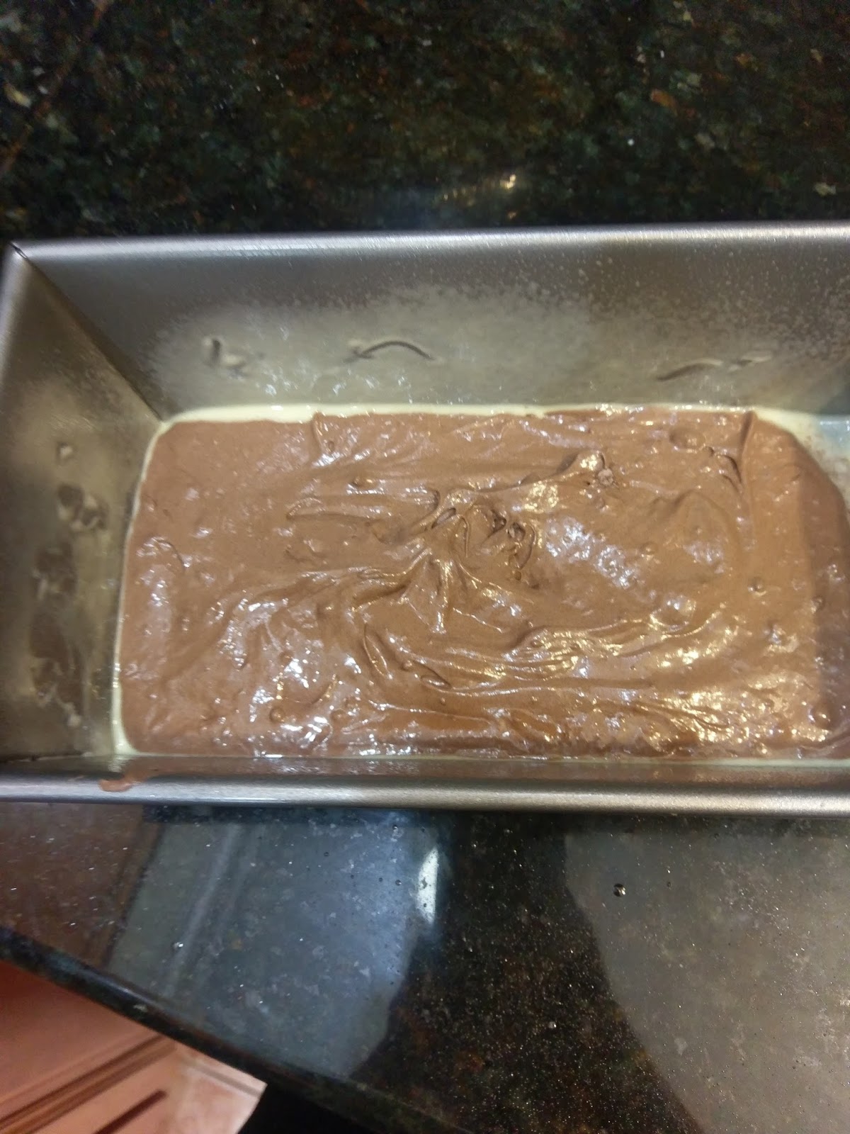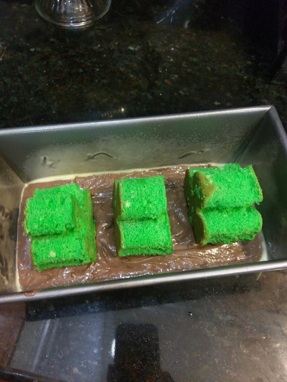 I recommend letting your clovers freeze completely to avoid over baking, so if you can’t leave them in the freezer overnight, at least let them freeze for a few hours. Once frozen, ensure your oven is set to 350 and begin making your chocolate cake. Mix together the soda, cake mix, and egg whites for 2 minutes. Pour about 1/2-3/4 of a cup of batter on the bottom of your very well greased 10×6 loaf pan. Save the look of scorn and betrayal as you know eventually you’re gonna make one hell of a banana bread in this pan no matter what it does to this cake.