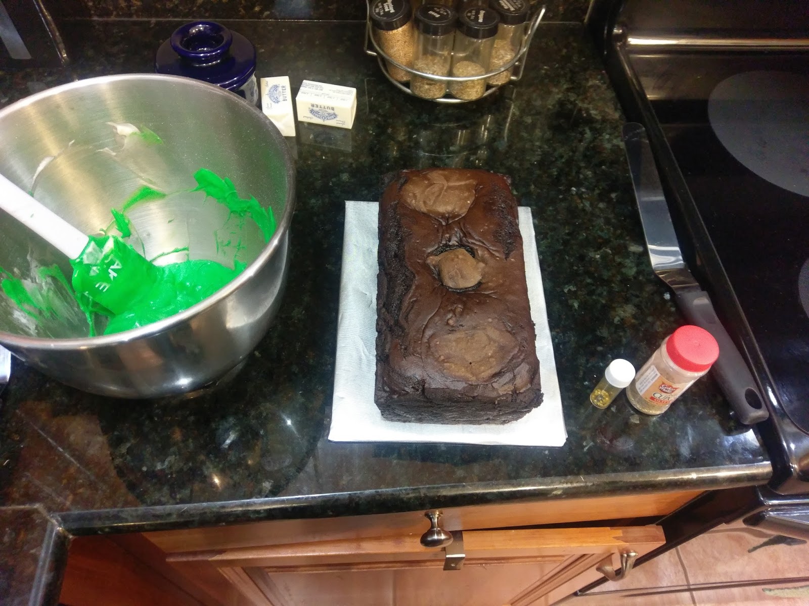 Start by baking the white cake mix. Preheat your oven to 350 and blend the white cake mix, egg whites, and creme soda for 2 minutes. Add a large heaping amount of green gel dye to this mix and blend. Now let me tell you about the type of pan you SHOULD use and not the one I used.