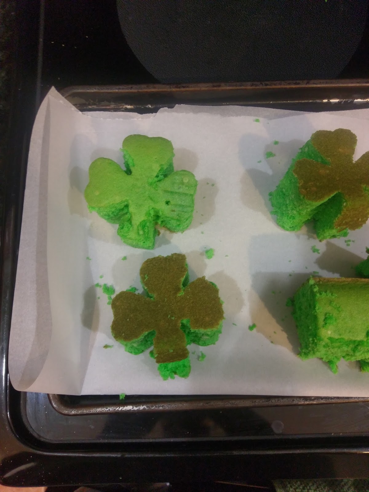 I was only able to yield 3 very fat clovers from my green loaf cake. I ended up having to stamp my cookie cutter down in the actual middle of the cake instead of cutting into loaves since my cake, much like its baker, was vertically challenged. My Wilton shamrock cookie cutter (obtained from Amazon) was only 3 1/2 inches high, and I mistakenly thought it was going to end up being too short. Oh to go back to that wonderful ignorance. After I yielded my three fat clovers, I placed them on a Parchment-lined baking tray and put them in the freezer overnight. Kate Panic Stage 5 then came to pass. This stage of panic is known as the “acceptance and eating of all the cake remnants” stage because nothing says “I’ve got this” quite like a grown woman eating cake scraps at 10:00 p.m on a Saturday night.
