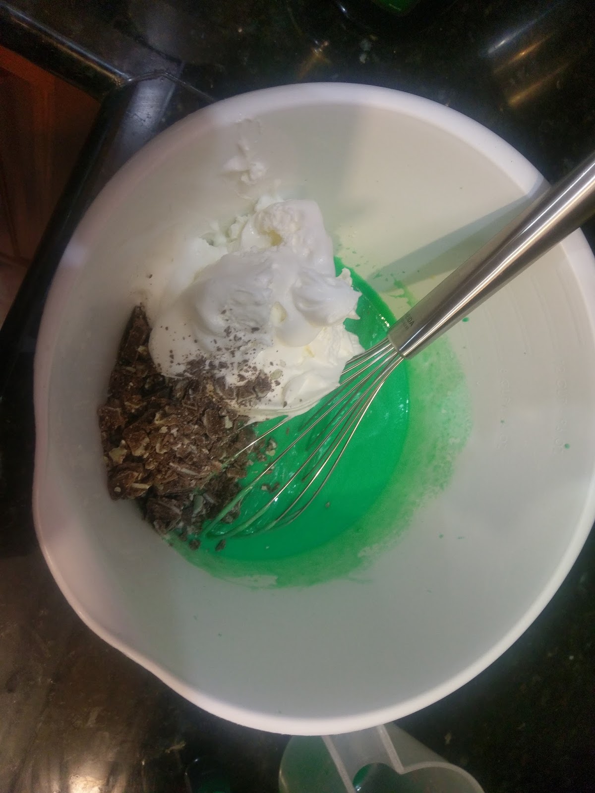 Start by mixing the booze, milk, and pudding into a large bowl for 2 minutes with a whisk. Your biceps will appreciate the small workout. Then, add 1 1/2 cups of the Cool Whip, the crushed Andes mints, and 2-3 drops green food coloring. Mix together, and then see if the pie is minty enough for you. I wanted to be smacked in the mouth with wintergreen freshness, so I added an additional 1/4 tsp of pure mint extract. Much like time spent around other people’s children, a little goes a long way, so increase the amount of extract you want in small increments until it meets your taste preferences.