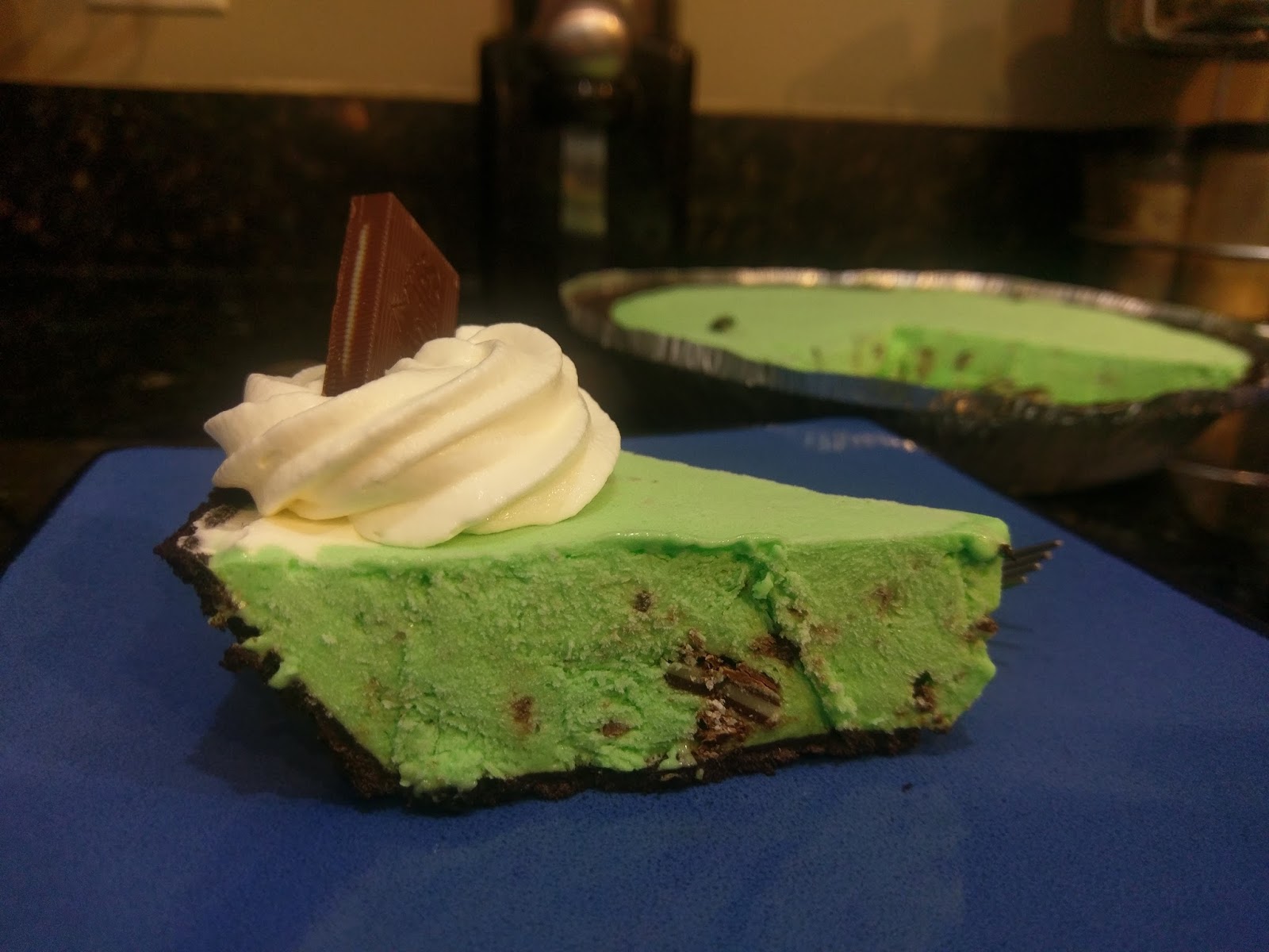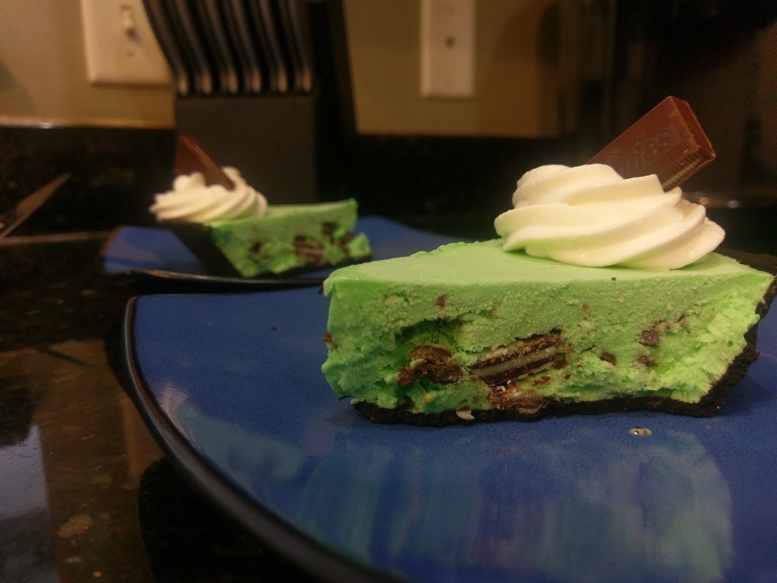 Once mixed and minty enough, dump your pie filling into the Oreo crust and smooth out. Place into the freezer for at least two hours to set. I left mine in the freezer overnight, and it sliced through perfectly:
