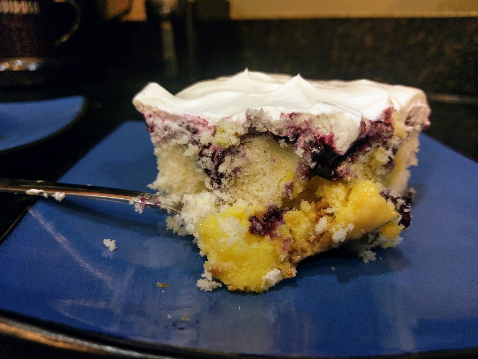 Say goodbye to simple lemon poke cakes–layer them all with blueberries! I took a more is more approach with this cake; what can I say, I relish the opportunity to outdo myself culinarily. At only 204 calories per 12 slices, I’ve also outdone myself in the flavor to calorie ratio. I’d let you congratulate me, but clearly I’m still too busy patting myself on the back for coming up with this idea. I did, however, fail epically at remembering to take photos while making parts of this cake. I was trying to clean the house, do laundry, make dinner, and prepare for my in-laws to visit all in one evening. Even I have my moments. I will say it was totally worth all the effort and slight delirium. Not only did my husband’s parents get treated like they were in the finest of cozy hotels, they even got cake. When was the last time Hilton did that for anyone? Exactly.