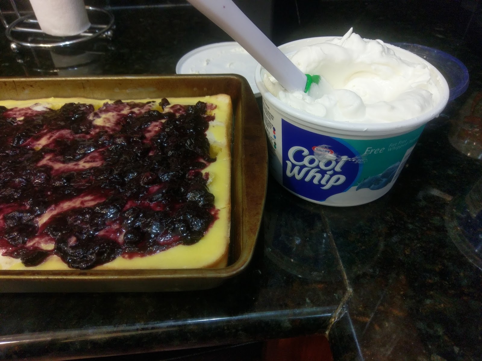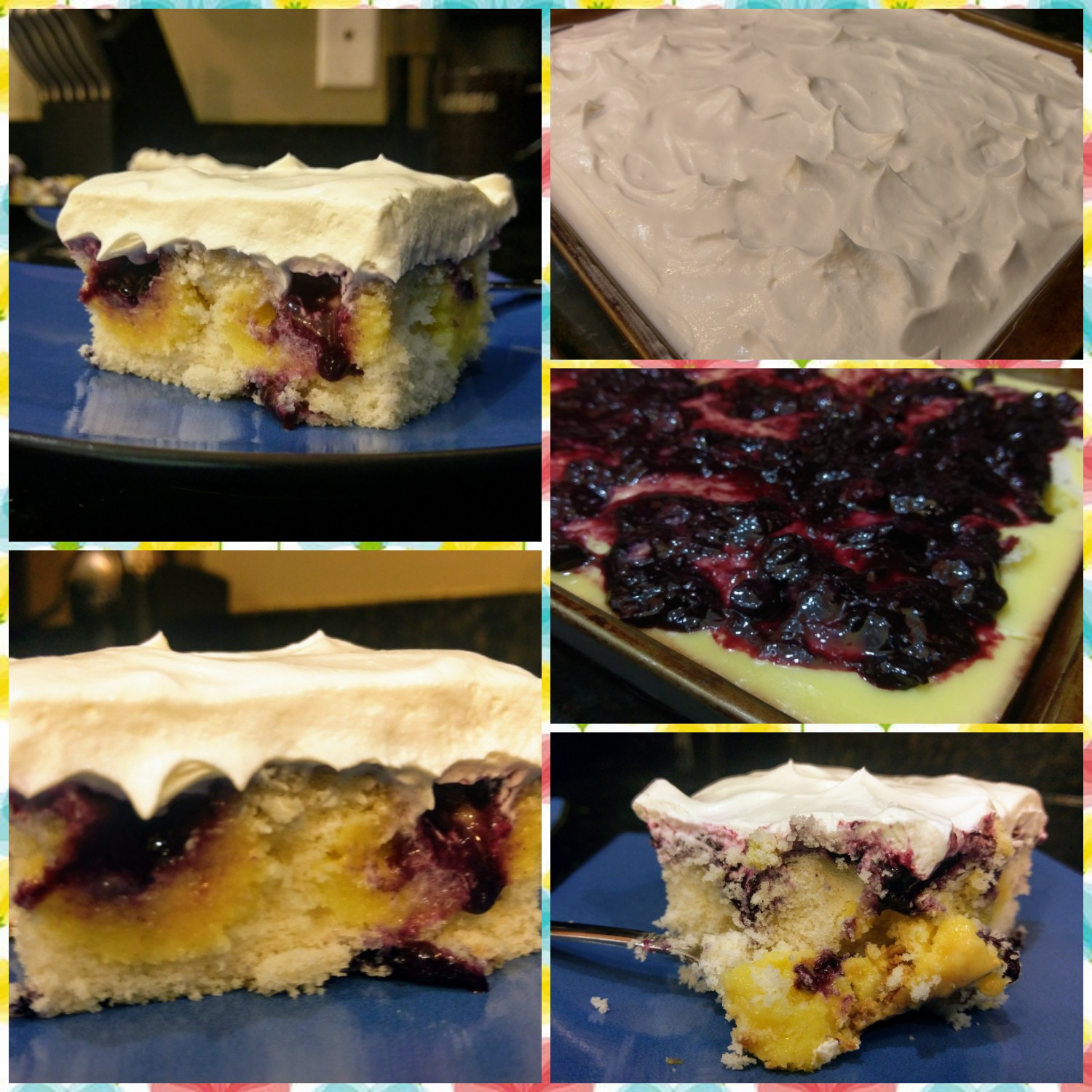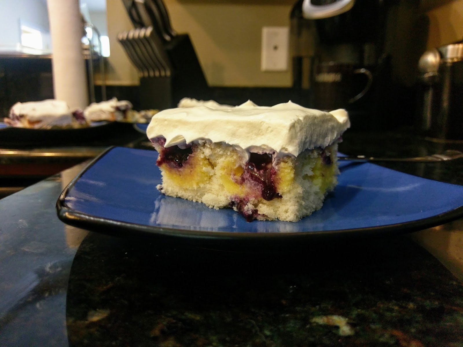 Carefully pour the blueberry mix a little at a time on top of the pudding layer. Use a spatula to help you spread it out evenly. Some of it will spread into the poked holes while the rest creates a thin layer on top of the cake. Either way, it’s going to amount to a perfect forkful with each bite. Now, place into the freezer for at least two hours to set.