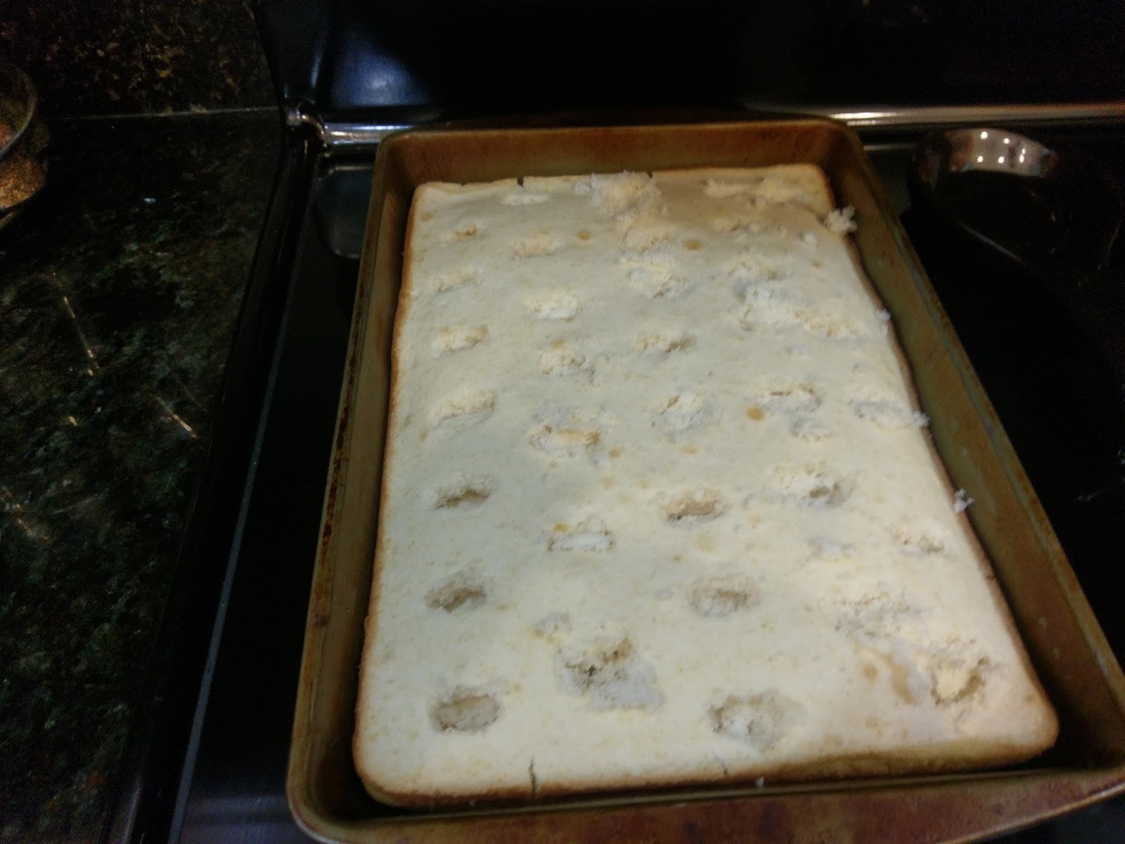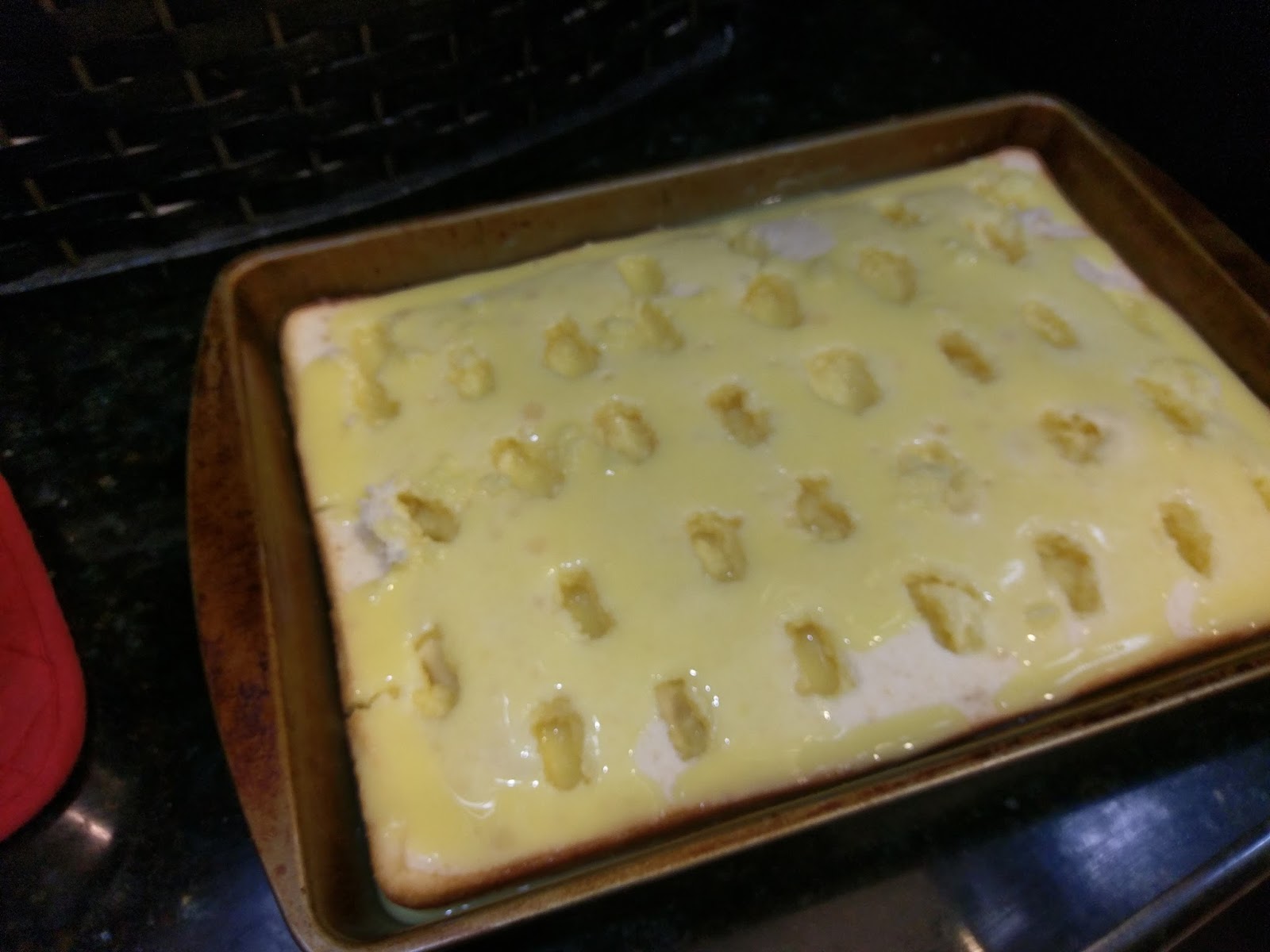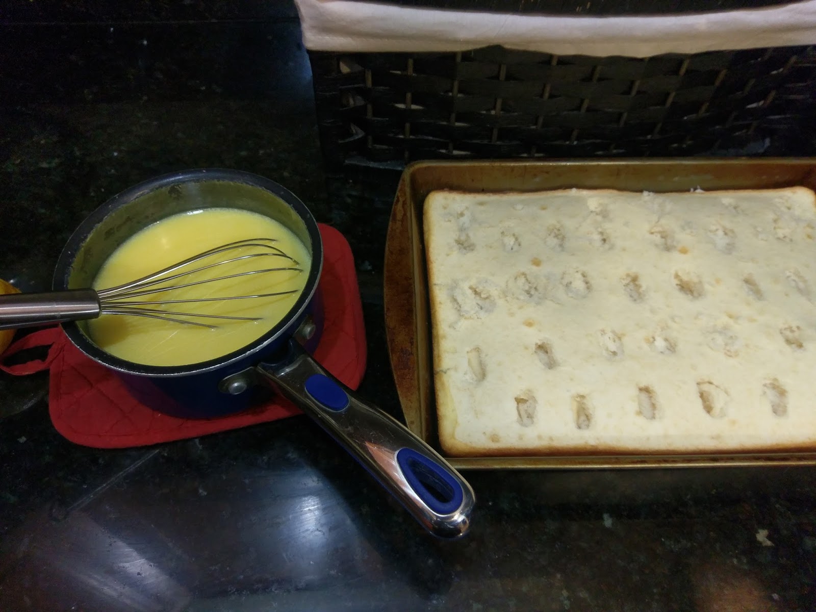Once cooled off a bit, slowly and carefully pour the mix into all the holes you poked in your cake earlier.