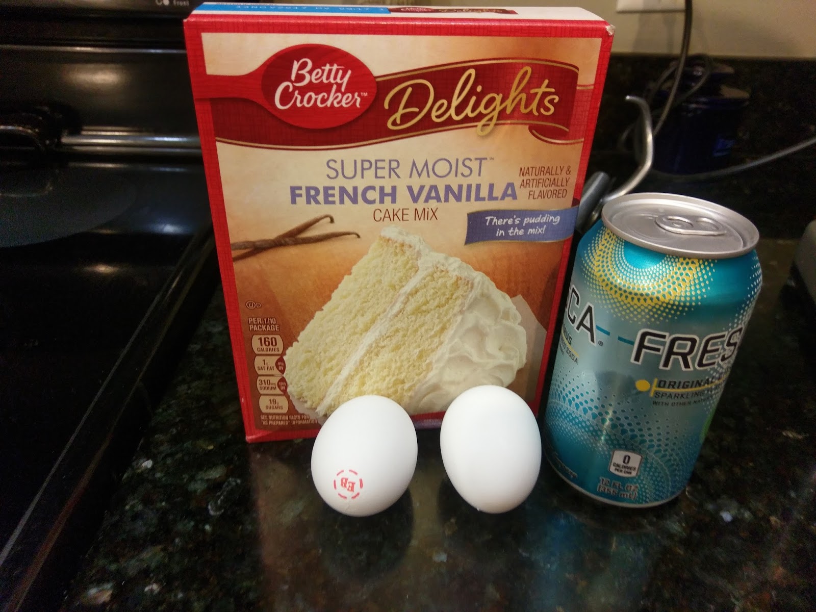 To make the low cal cake, grab a box of vanilla or white cake, two egg whites, and 10 ounces of diet lemon-lime soda; I used Fresca because I’m 87 years old and enjoy drinking Fresca, but Diet Sprite would work just fine as well. Mix all three ingredients together for 2 minutes, preheat your oven to 350, and grease a 9×13 cake pan. Pour your batter into the prepared pan and bake for about 23-25 minutes (remember, cakes baked with soda cook faster than the times on the box).