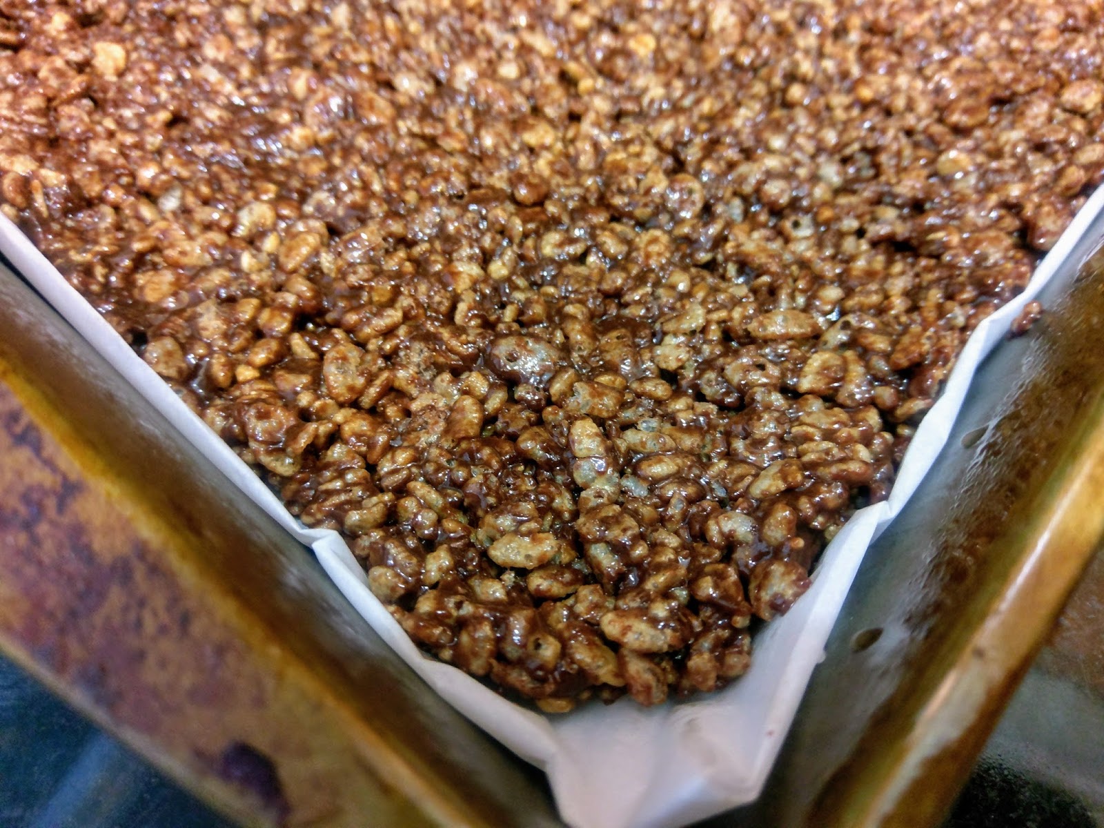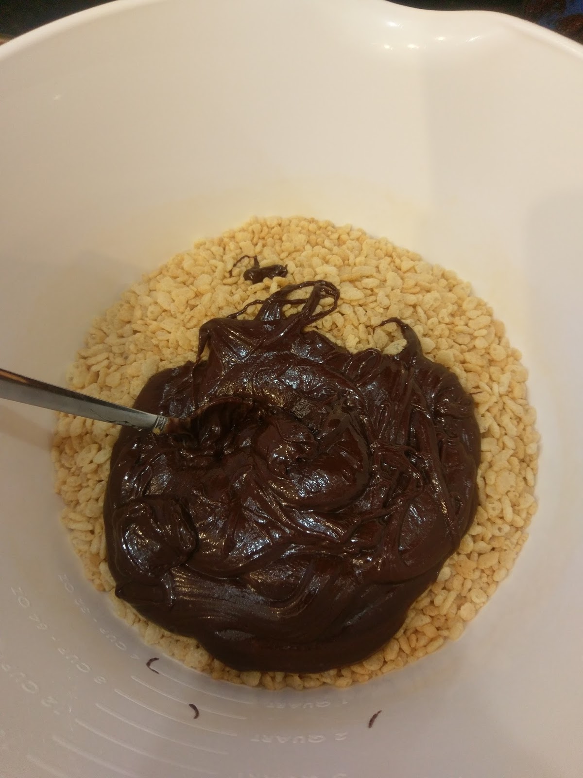 Dump 3 cups of Rice Krispies in a large bowl, and then pour the chocolate mix on top. You’ll get a nice bicep workout blending this thoroughly.
