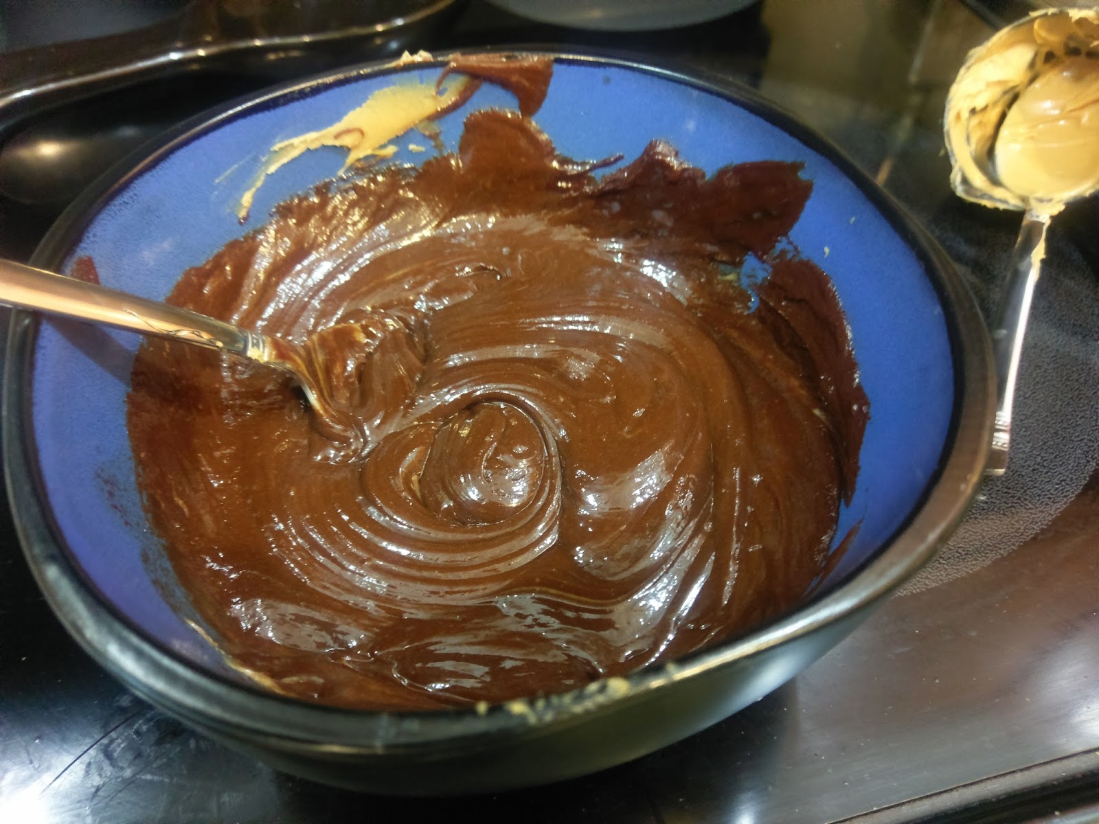 In a bowl, dump the chocolate chips and milk and heat in 30 second bursts at 50% power in the microwave. Stir each time to avoid scorching. Burnt chocolate is my mortal enemy. Once completely melted and no chunks remain, add in the 3 TBS of honey and 1/4 cup of Jif. Blend well!