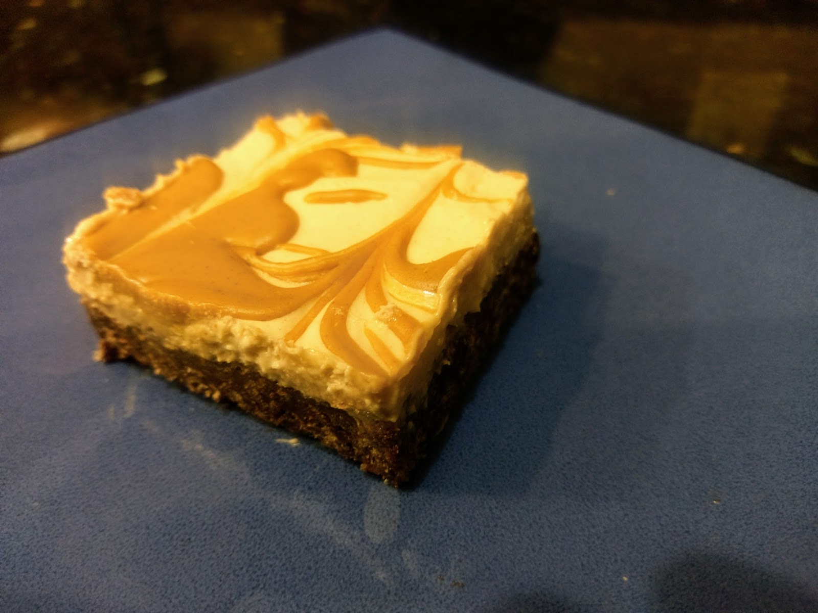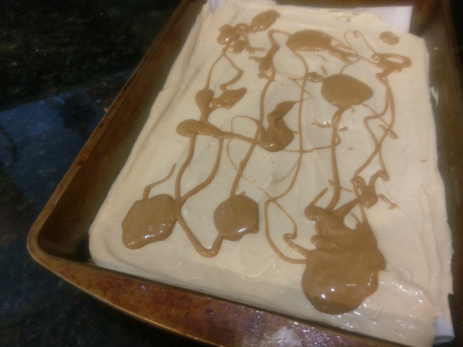 By the spoonful, plop the melted peanut butter randomly on top of the cheesecake layer.