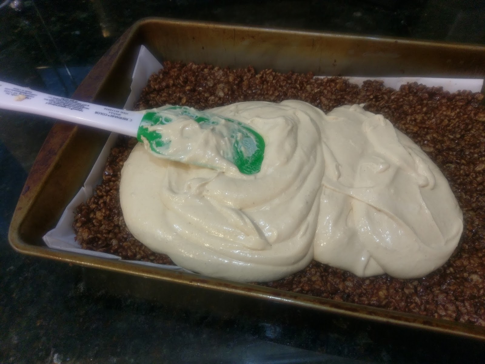 Take this delicious blob of peanut butter wonder and dump on top of the crust. I’d like to tell you the crust lust and desire to eat it gets covered up by this cheesecake layer, but that would mean my pants would burst into flame.
