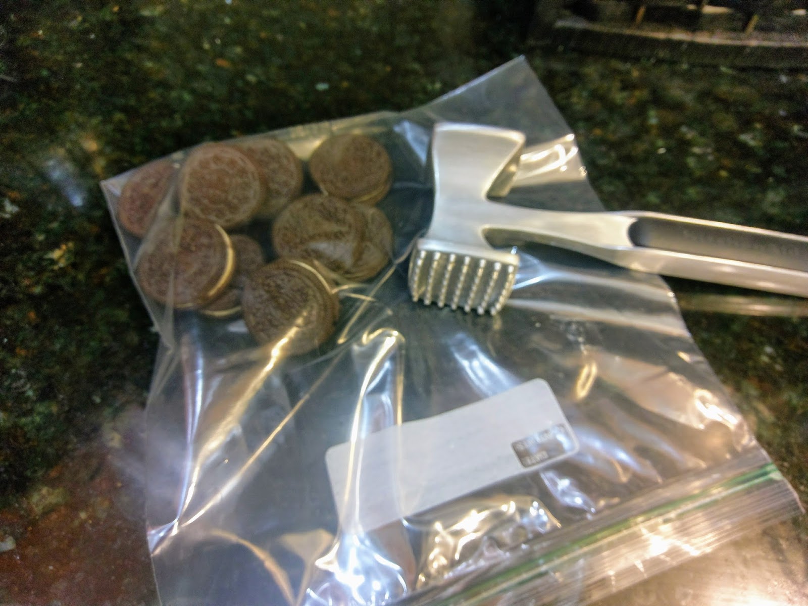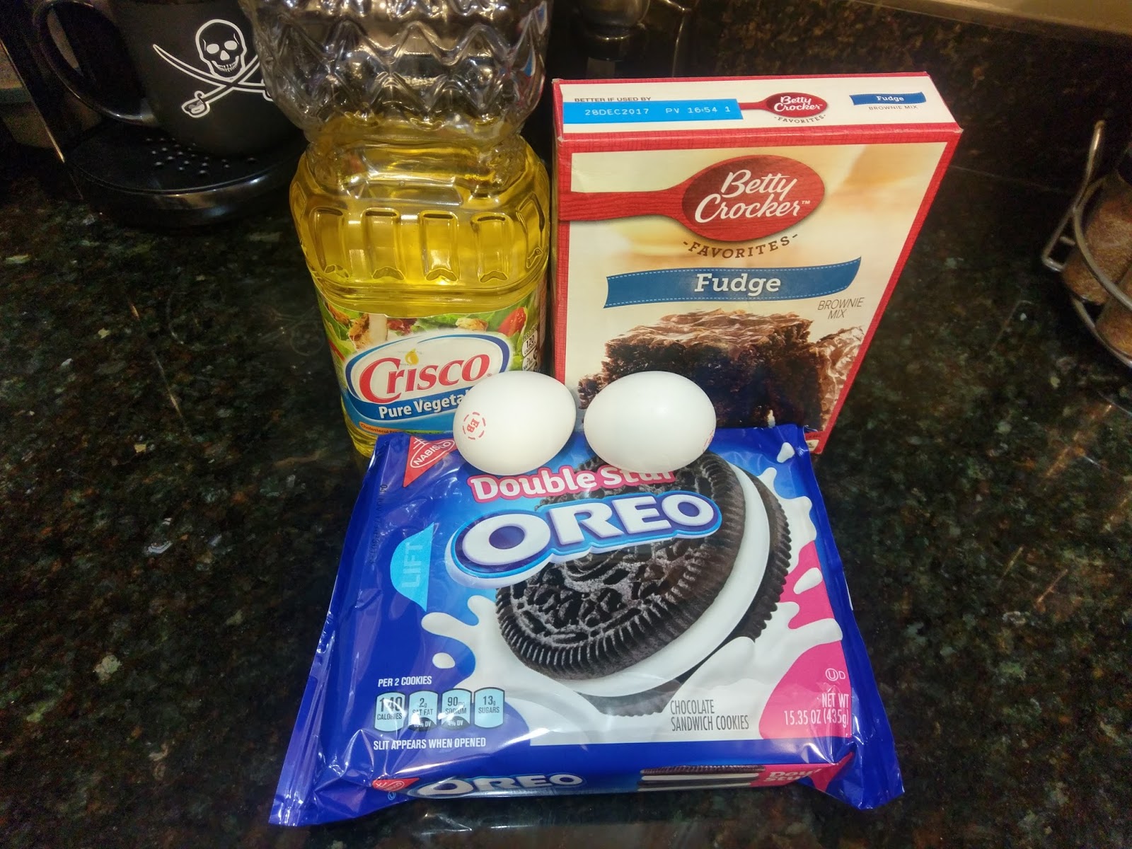 I’ve recently acquired a meat tenderizing mallet, which I loving call “The Pulverizer.” I placed my 10 Oreo’s into a plastic bag and, well, pulverized them into chunks. Dump this into your brownie mix and give it a good stir.