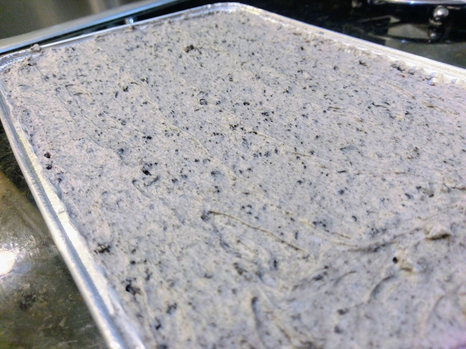 Mix together the butter, sugar, and 2 TBS of milk until smooth. Really grind up the 8 Oreo’s to a fine pulp and then add them to your frosting and mix. Depending on the consistency you’d like, either add a half to another whole tablespoon of milk after you’ve added the Oreo crumbs. I went with another 1/2 TBS (for a grand total of 2 1/2 TBS) to get a smooth enough frosting that was easy to spread but would still set.