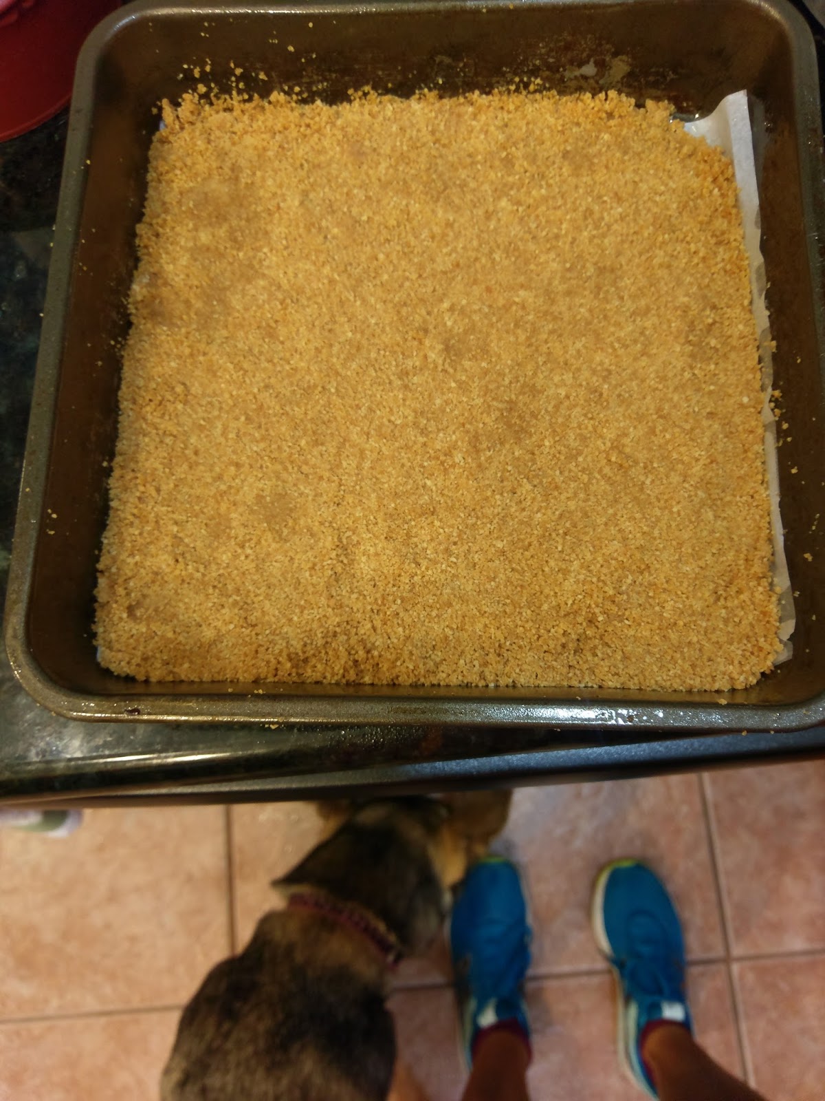 Take the topping and evenly frost the top of your bars/squares with it. Smooth out as best as you can, and then find that half a sheet of graham cracker I told you to save awhile ago. Did you eat it? Yeah, accidents happen. Just grab another half sheet then and crush it into a fine mixture. Sprinkle this on the top of your bars to complete the recipe and make it look pretty. Everything looks better with a fine coating on top (this is precisely why I wear makeup).